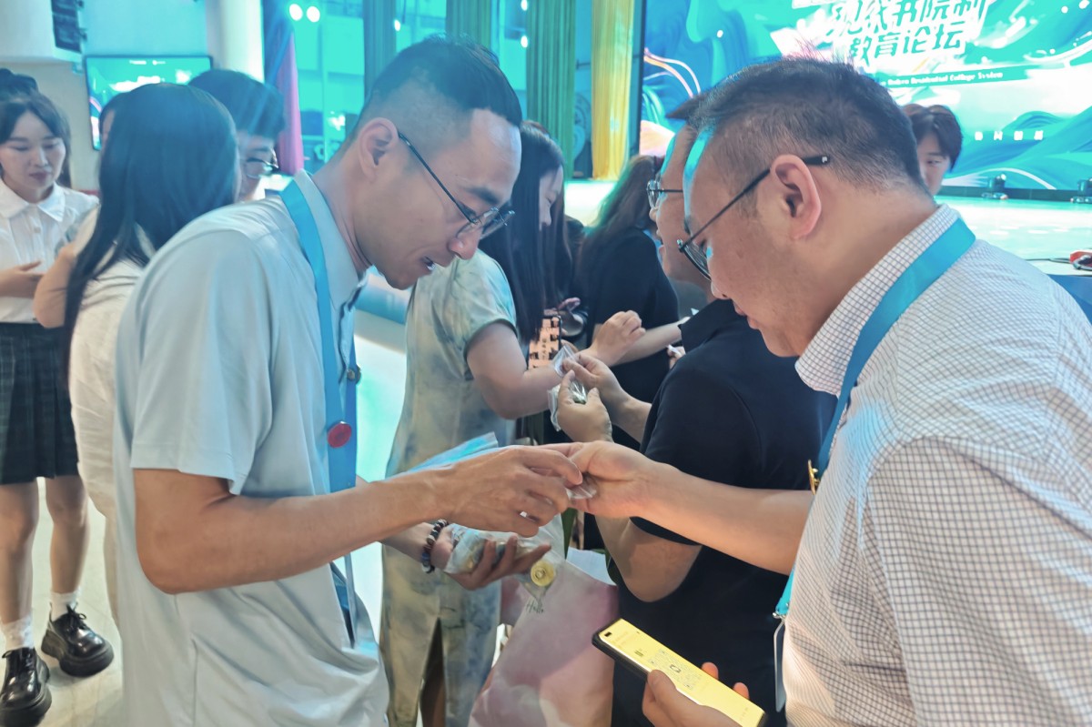 在听取西安交通大学党委学工部部长张丹《智联书院,育见未来——数智时代书院制人才培养的创新路径》、华东师范大学大夏书院院长庞维国《面向大学生成长需求的书院课程设计》、香港中文大学联合书院副院长邓思颖《教育数字化时代下的书院发展》等大会特别报告后,我校教师深受启发,就人工智能如何更深度融入书院育人场景、数字化资源如何优化配置以满足学生个性化成长需求、书院与学院协同在数字时代的新内涵等前沿问题,与各高校参会代表进行了热烈探讨。活动现场还特别设置了温馨的“交换校徽”环节,我校教师与多所高校书院同仁互赠纪念品,建立了深厚的友谊与合作意向。