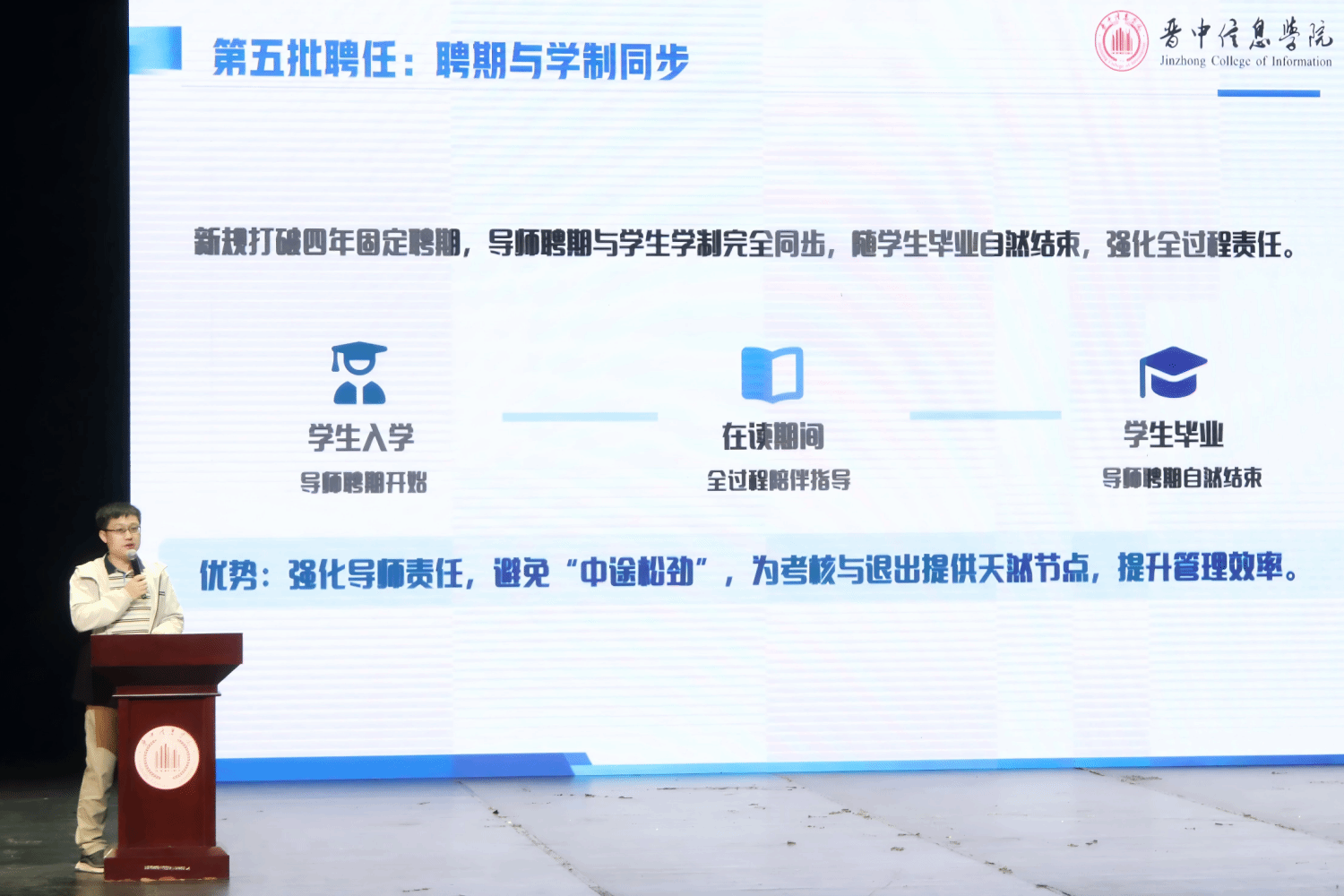 书院部部长李鹏鹏老师着重围绕《全生异科导师制育人理念新内涵》作深度解读,从制度优化背景、分档聘用机制、动态考核路径、“红黄线”过程监控管理等方面进行了系统阐述。他重点介绍了“A、B、C三档分级聘任、聘期与学生学制同步、月度绩效留存与即时淘汰”等新机制,强调通过制度闭环实现“优绩优酬、能进能出”,以激发导师队伍持续活力。同时他期望全体异科导师以学生发展为中心,在工作中永葆热忱、恪守规范、明确角色,以推动导师角色实现从单纯陪伴者到“观察者、陪伴者、引领者”三位一体的升级,从而持续激发学生的成长内驱力。