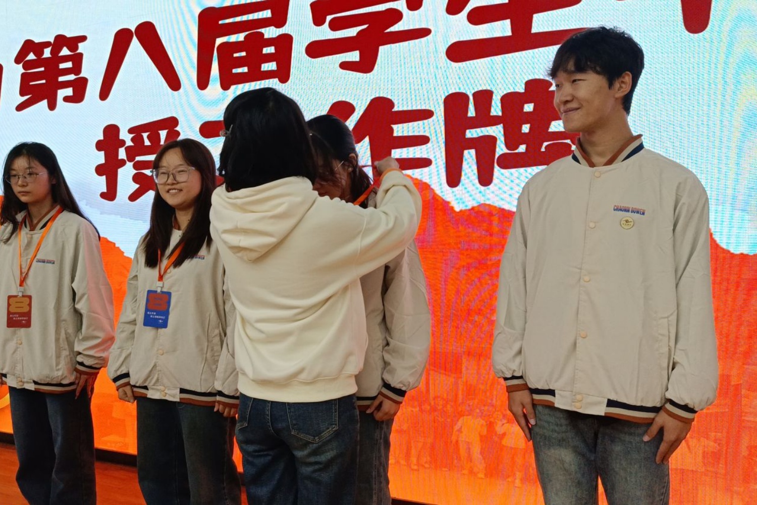 无边书院综合办导师团队为第七届学生组织干部团队颁发纪念品。手中的纪念品不仅是对过往付出的肯定,更是对“传承”二字的最好诠释。第七届主席团成员张花妮在发言中回顾了与伙伴们的两年时光,从干部技能大赛的热血拼搏到生日会的暖心互动,字里行间满是不舍与骄傲,“感谢无边书院帮我们拍摄的这部青春查重率为零的群像剧”,一句话让在场不少人湿了眼眶。