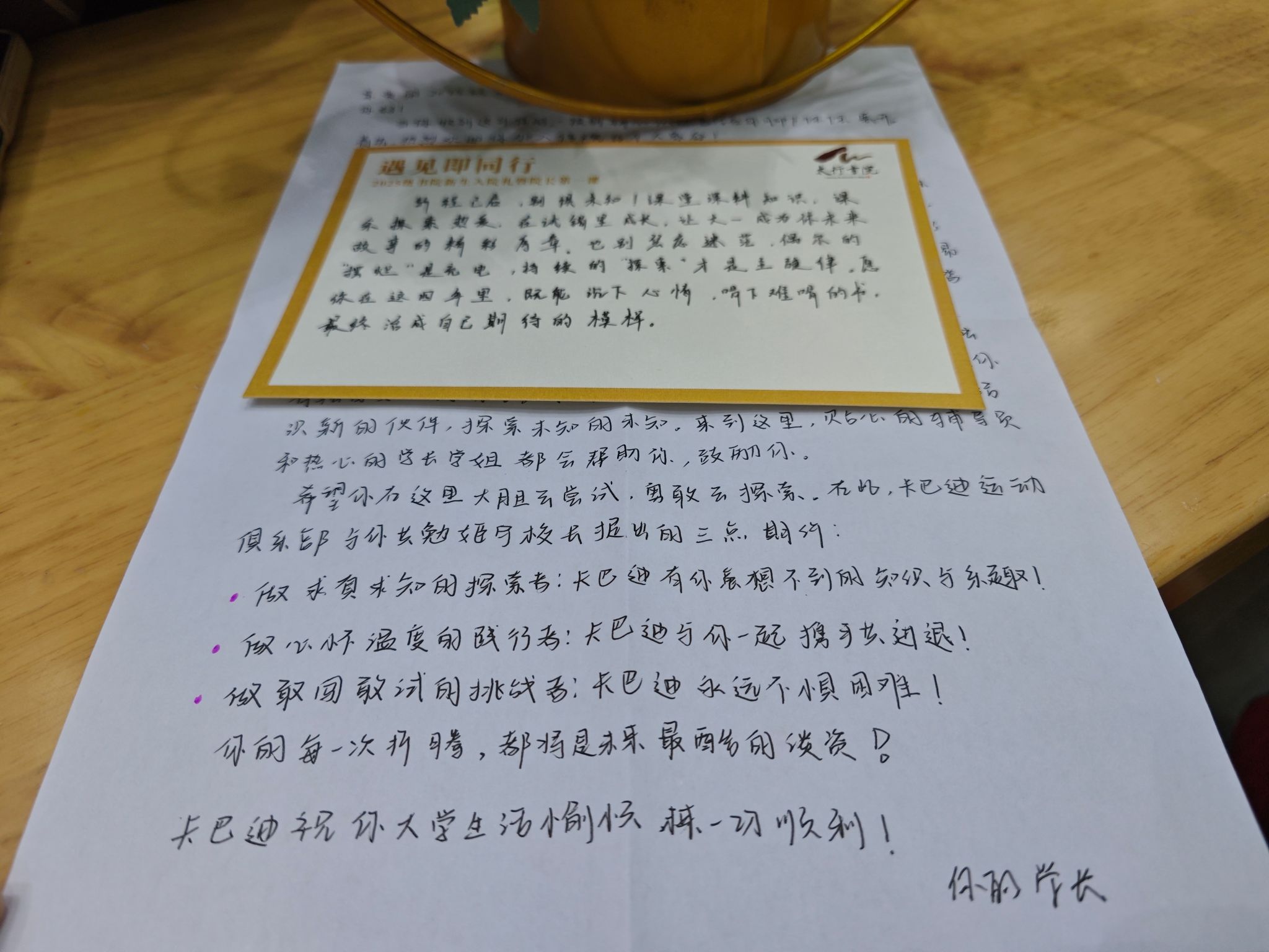 入口处,一份特别的“见面礼”正静静等候新同学——一个个印有书院标识的定制信封里,装着太行书院“主人翁”们的亲笔信。一封封手写信,不仅是对新生的热烈欢迎,更凝结着书院不同身份“家人”的真挚心意与殷切期盼,将书院的“家”文化藏进了字里行间。信封内,不同身份的“家人”写下了各自的心声。小萌新们认真轻吟一封封饱含赤诚鼓励,温馨叮嘱的亲笔信,将未来四年在书院的愿望写在回信区—希望四年后,我也能成为带给别人温暖和力量的人。一取一留间,完成了书院文化从师长到新生、从过往到未来的深情传承,更让“家”的温度在代际间流淌,让“同行”的力量在岁月中延续。