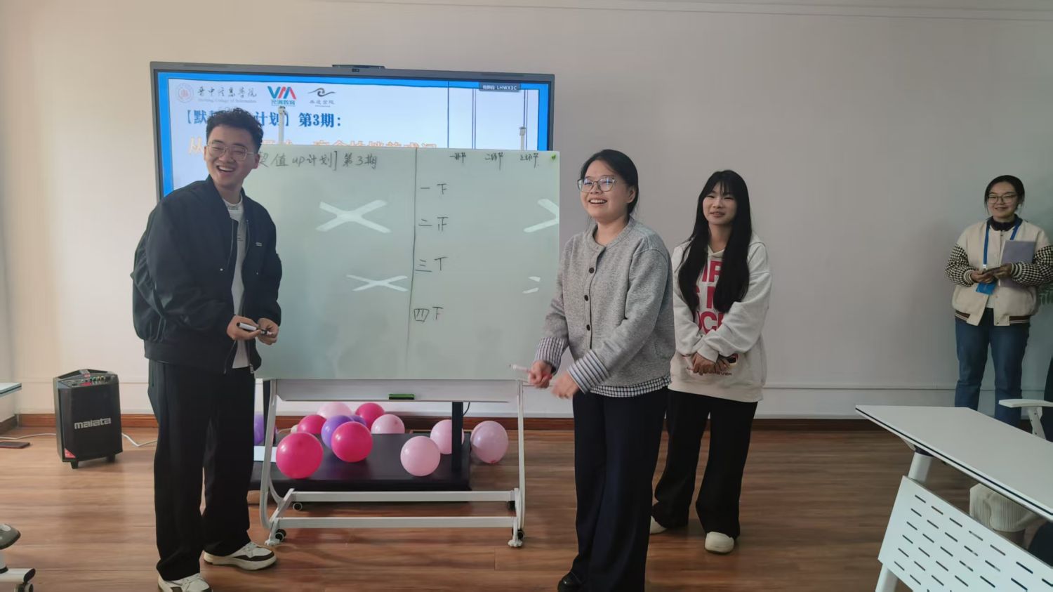 首个环节“歌词接龙”便考验了舍友间的“曲库”储备与反应速度。一组成员凝神聆听播放的歌曲,另一组则随机喊停,被中断的小组成员需即刻接唱下一句。歌声不仅串联了旋律,更串联起了队员们初建的默契。随后的“你画我猜”环节将活动推向了又一个高潮。每队派出两人,一人负责用画笔天马行空地演绎,另一人则需在短短三分钟内争分夺秒地猜测。题目千奇百怪,从历史人物“吕布”到动漫角色“电击小子”,再到童年回忆“小头爸爸”,在这一比一划、一“猜”一笑间,队友间的了解与关系在不知不觉中悄然深化。“数字炸弹”游戏则在1到500的范围里,同学们轮流报数,猜测范围随着每一次报数逐渐缩小。最终,当“幸运儿”猜中关键数字的瞬间,气球应声爆炸,突如其来的声响与欢笑交织,现场气氛热烈而欢快。三个环节层层递进,在游戏的纽带下,默契悄然生成,友谊逐渐升温。