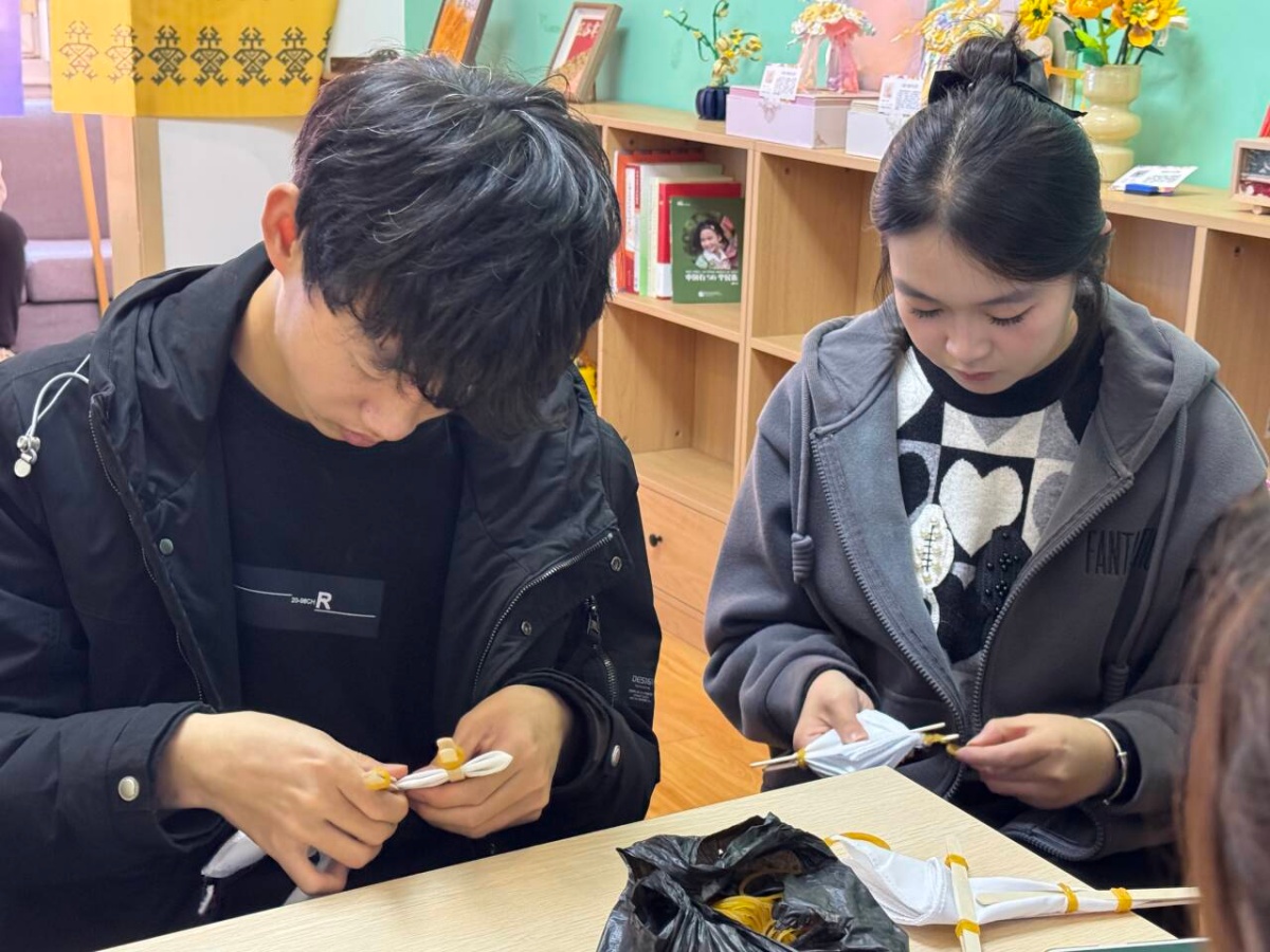 实操开始,志愿者先拿了块白布做示范:“要染出理想的纹样,指尖力道的把控至关重要。”她一边讲解,一边将白布顺时针旋转拧紧,“力道过重,布料会过度褶皱;力道过松,纹路则难以成型。”用指尖捏着两边,转着顶端一头转,白布慢慢缩成个小小的长条状。同学们凝神观摩,随后纷纷动手,将手中的白布通过不同的捆扎方式塑造成形态各异的“布球”。这一刻,现场仿佛一场与传统的静默对话,每个人都全心投入,在绳与布的缠绕间,体会着匠人专注一事的沉静心境。