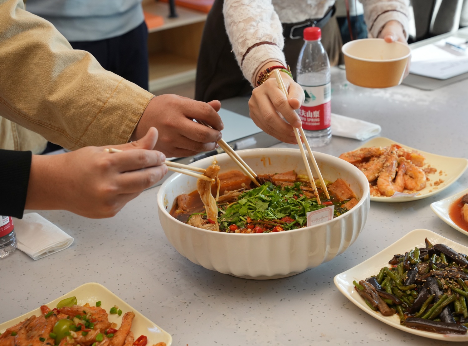 灶火暂歇,香气未散,一场关于风味与创意的对话在灶台边温情展开。评委老师们细品每一道菜肴,从创意、味觉、协作、主题契合度等多维度进行评分。选手们在答辩环节娓娓道来创作初心:“希望用鸡翅与虾滑的碰撞传递双重鲜美”“愿以热烈的麻辣驱散冬日微凉”。评委们不仅关注菜品本身,也关注团队协作中的细节与成长,更见证着他们从“校园厨星”向“风味主理人”的蜕变。经激烈角逐,“懒羊羊当大厨队”“五味掌厨团”与“菜不可挡队”三支队伍脱颖而出,分别荣获“金勺校园厨神团”“鲜厨破茧成长团”与“风味共鸣人气团”称号,其成员分别被授予“校园风味主理人”“鲜厨精工能手”及“风味故事传递者”荣誉。更重要的是,他们成功斩获翟谷书院望野・共享厨房的运营权,将于11月开启为期一月的“掌勺厨房周”真实商业运营。