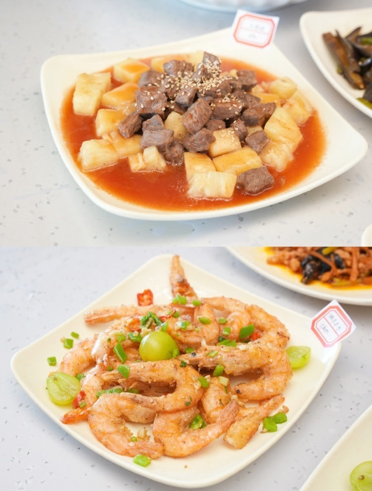 “懒羊羊当大厨队”将鲜嫩虾滑裹入鸡翅,煎得外皮焦香、内里多汁,呈现双重鲜美的交融;“王者熔炉队”端出翻滚红油的毛血旺,麻辣鲜香瞬间唤醒味蕾;“五味掌厨团”的酸汤肥牛热气袅袅,酸辣开胃;“菜不可挡队”的干锅虾金黄酥脆,酱香回味绵长。选手们在烹饪技法上精雕细琢,更在摆盘中融入绿植点缀与精致食雕,让每道菜品都成为视觉与味觉的双重盛宴。
