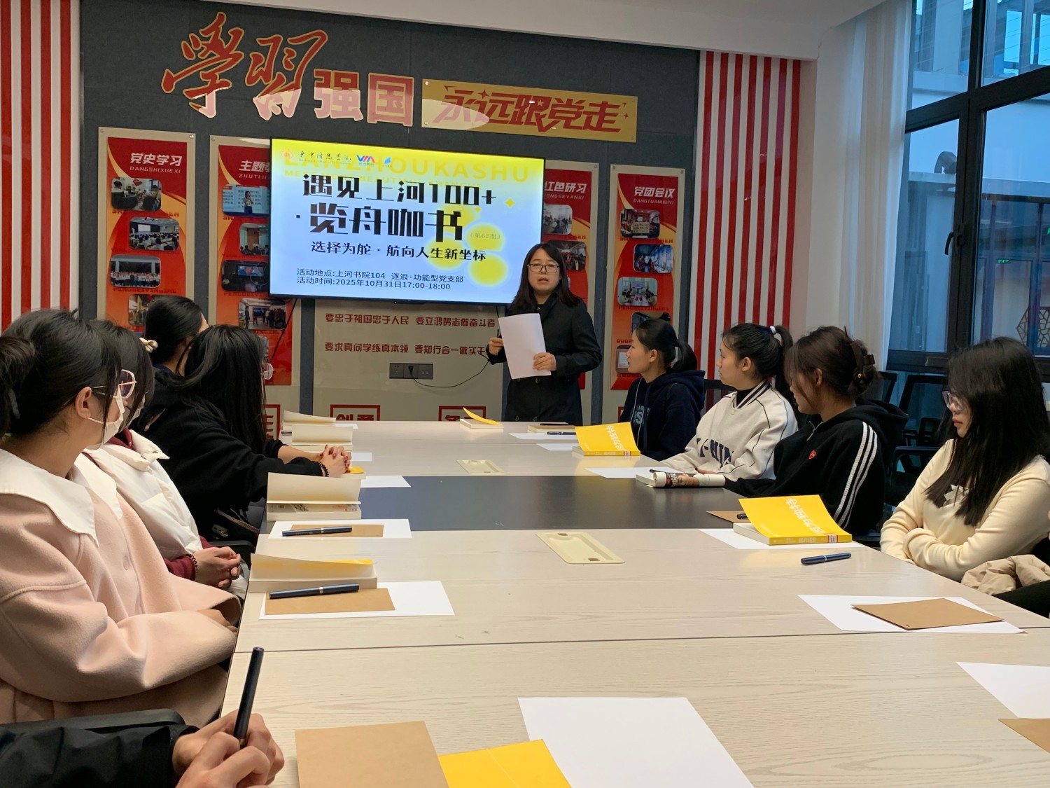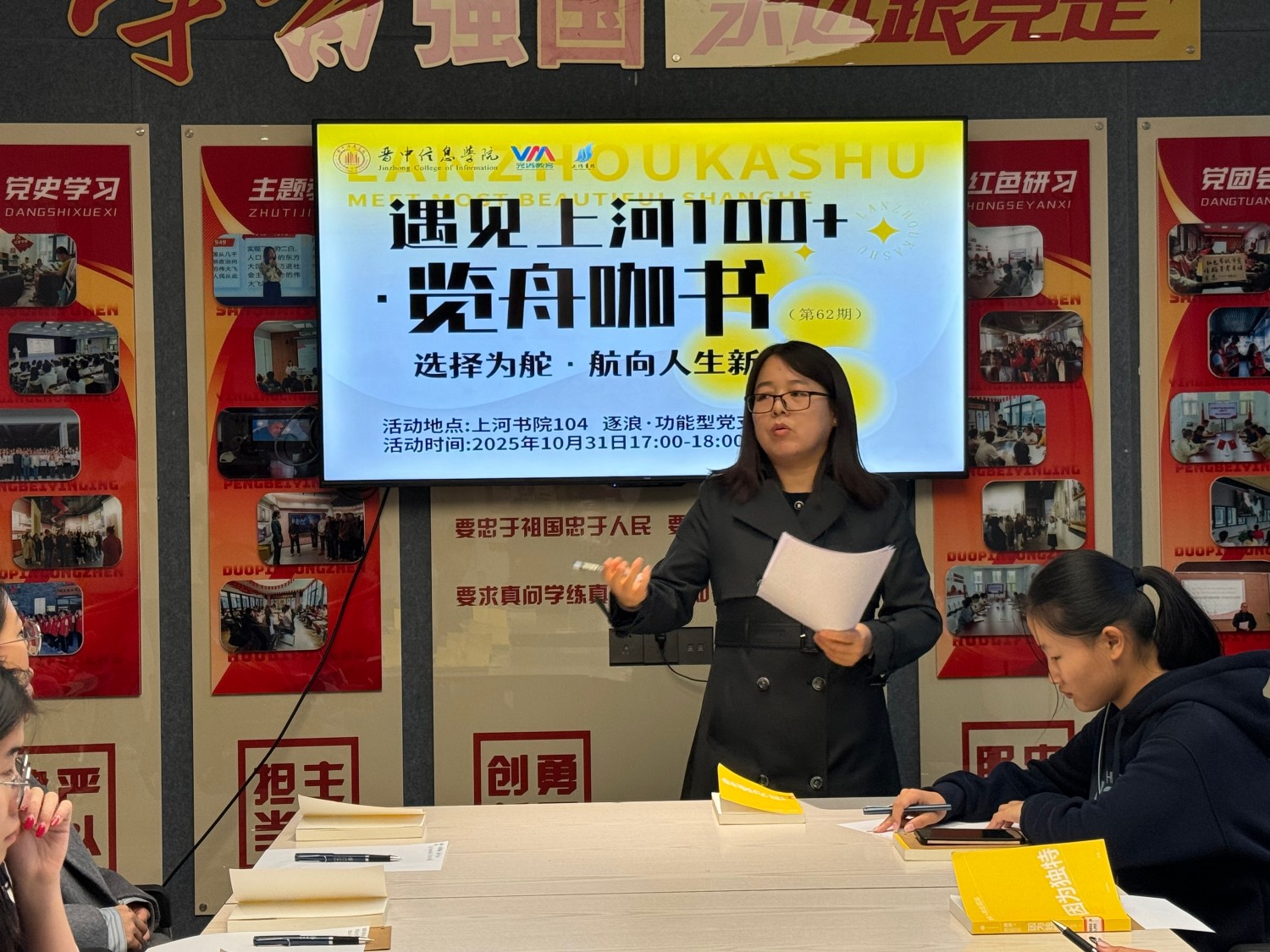 当多数人在“趋同”里寻找安全感,少数人正用“独特”打开人生新战场。10月31日17:00,“遇见上河100+·览舟咖书(第63期):选择为舵·航向人生新坐标”在上河书院104 逐浪·功能型党支部如期举行。本次活动由马克思主义学院的牛瑞凤老师以《因为独特》为核心文本,带领同学们在文字与思想的碰撞中,挖掘自我特质、梳理成长逻辑,寻找属于自己的“独特答案”。