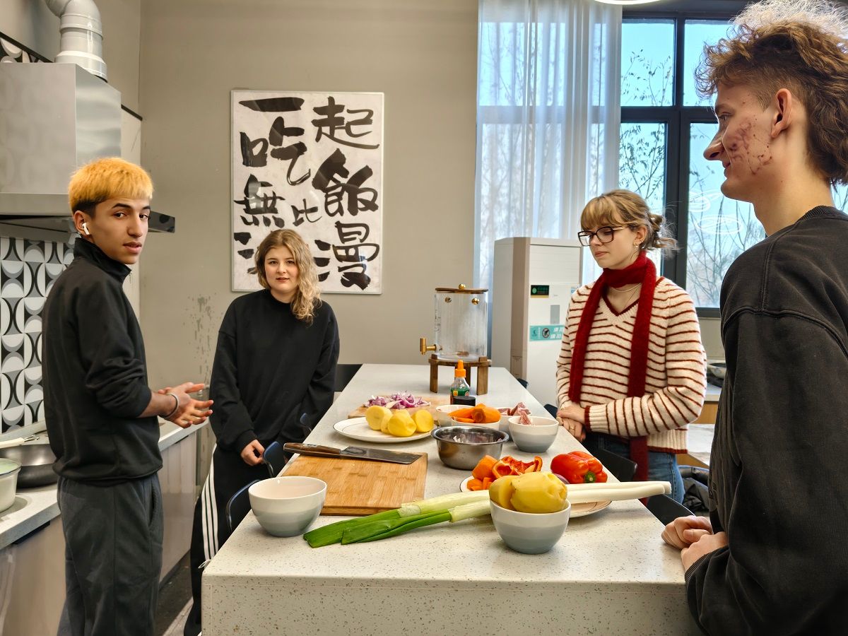 活动在厨房的烟火气中拉开序幕。同学们到场后便自由组合成三个小队,迅速投入到备菜环节。各小组成员围绕在操作台前,一边熟悉手中的食材与香料,一边热烈讨论着每一样材料的特性与用途。现场充满了欢声笑语,在亲手触摸与细细嗅闻中,大家对两国食材建立了直观的认识。经过一番协作准备,三个小组依次认领了烹饪任务:塔吉克斯坦经典鲜汤、山西疙瘩汤与山西醪糟汤的制作。