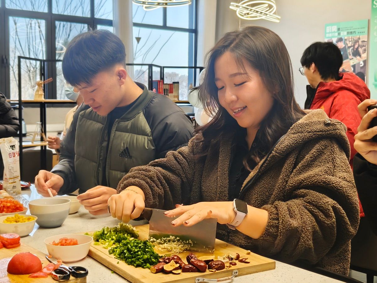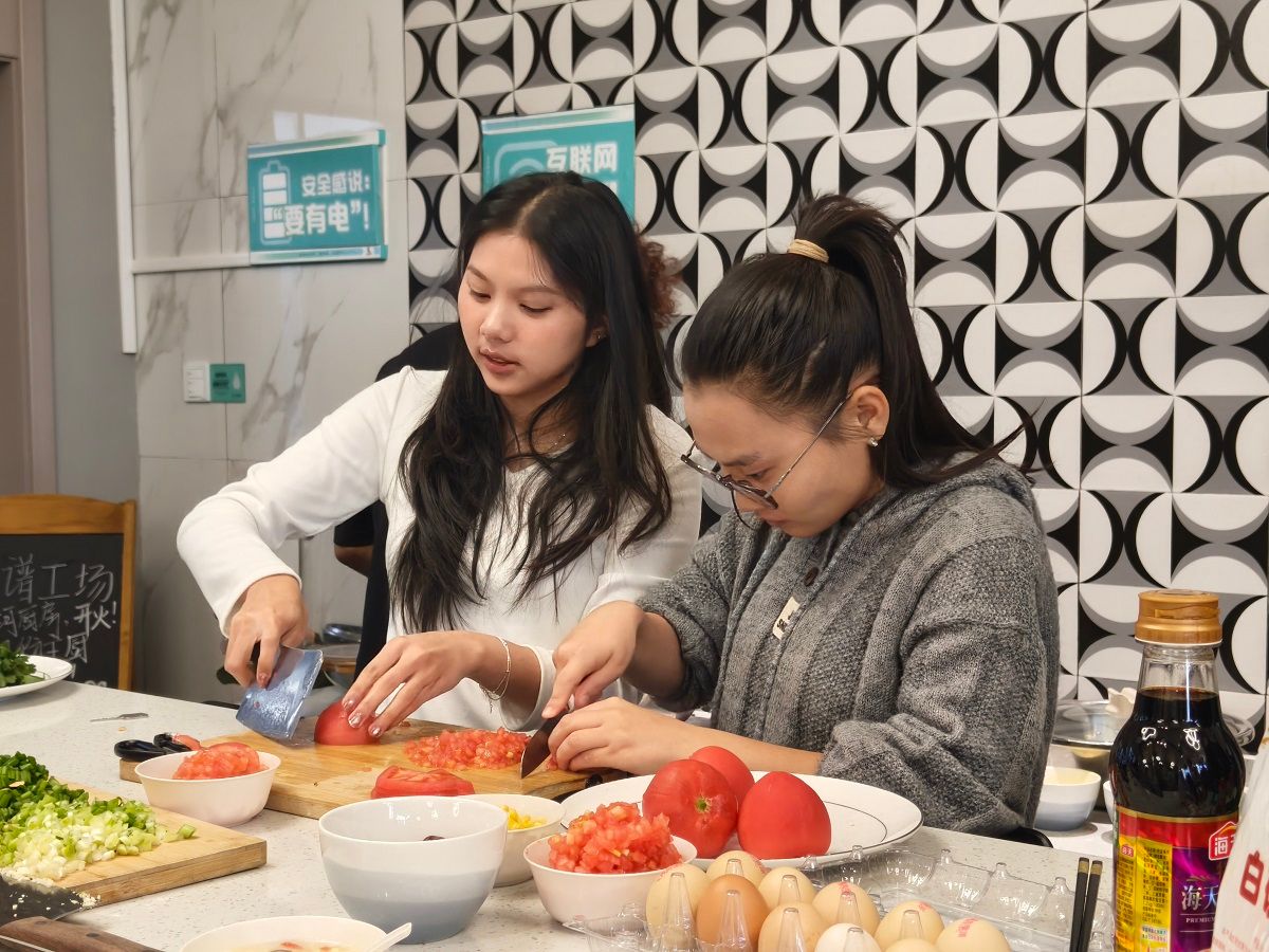 山西疙瘩汤组则展现了一场面与水的艺术。如何均匀地搅动面粉,才能飞出大小适中、口感筋道的面疙瘩,成了全组共同钻研的课题。有同学熟练地调制面糊,另一人则负责在滚开的汤锅中飞入面絮,其余组员则忙着将番茄炒出沙、将鸡蛋打成蛋花。整个过程需要精准的时机把握与默契地配合,小小的面疙瘩,串联起了整个团队的协作精神。