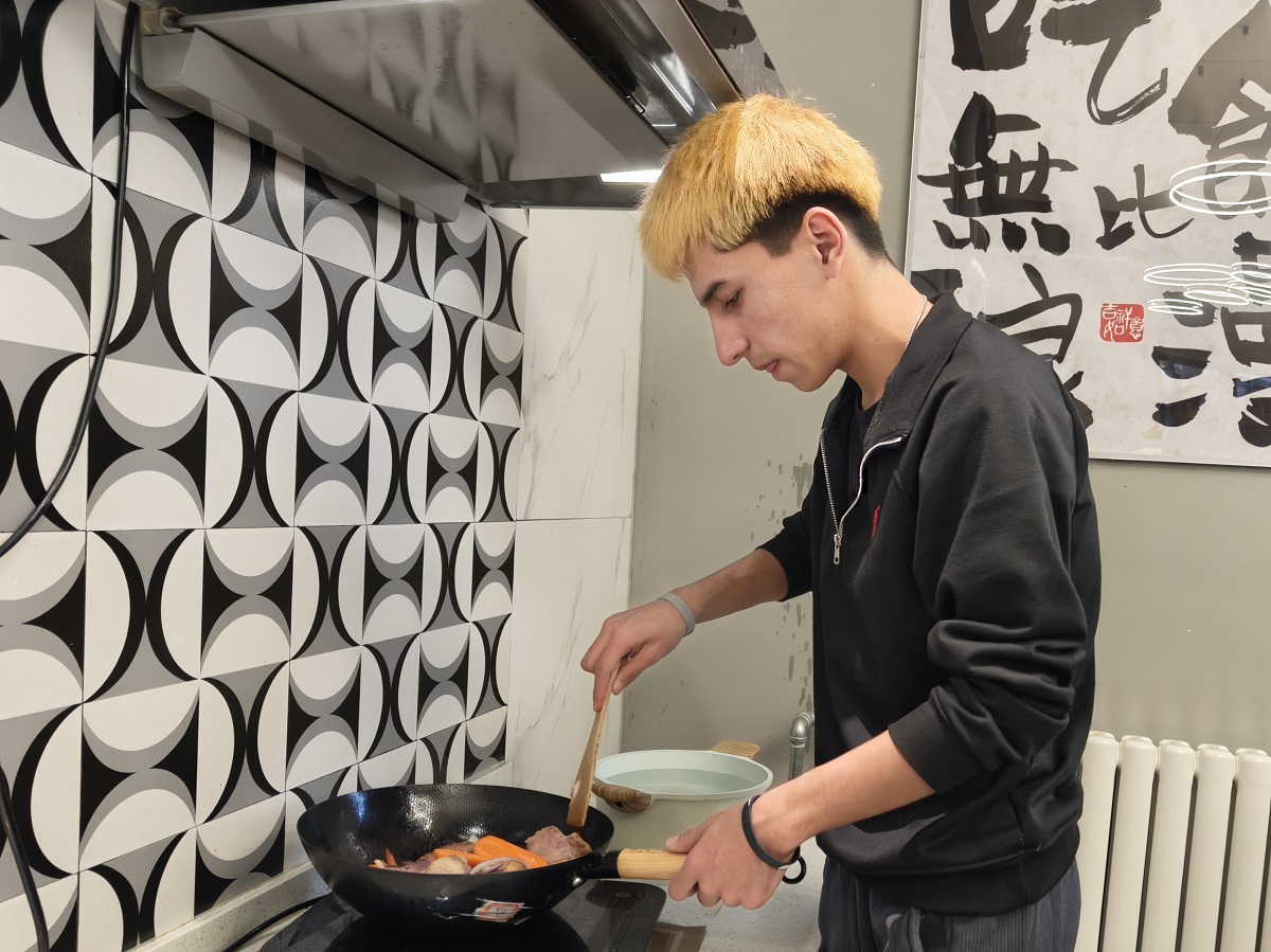 安静的厨房瞬间切换为热火朝天的“生产车间”。三个小组各据一方,开始了与食材的亲密对话。塔吉克斯坦鲜汤组的灶台前,弥漫着浓郁的异域风情。组员们分工明确:有人负责将羊肉切制成适口的方块,有人专注处理土豆与胡萝卜,另有同学仔细研究着香料投放的顺序与时机。当所有食材在炒锅中煸炒出香,再被注入清水慢火细炖时,整个小组都围在锅边,共同期待着汤汁在时间中渐渐染上醇厚的金黄色。