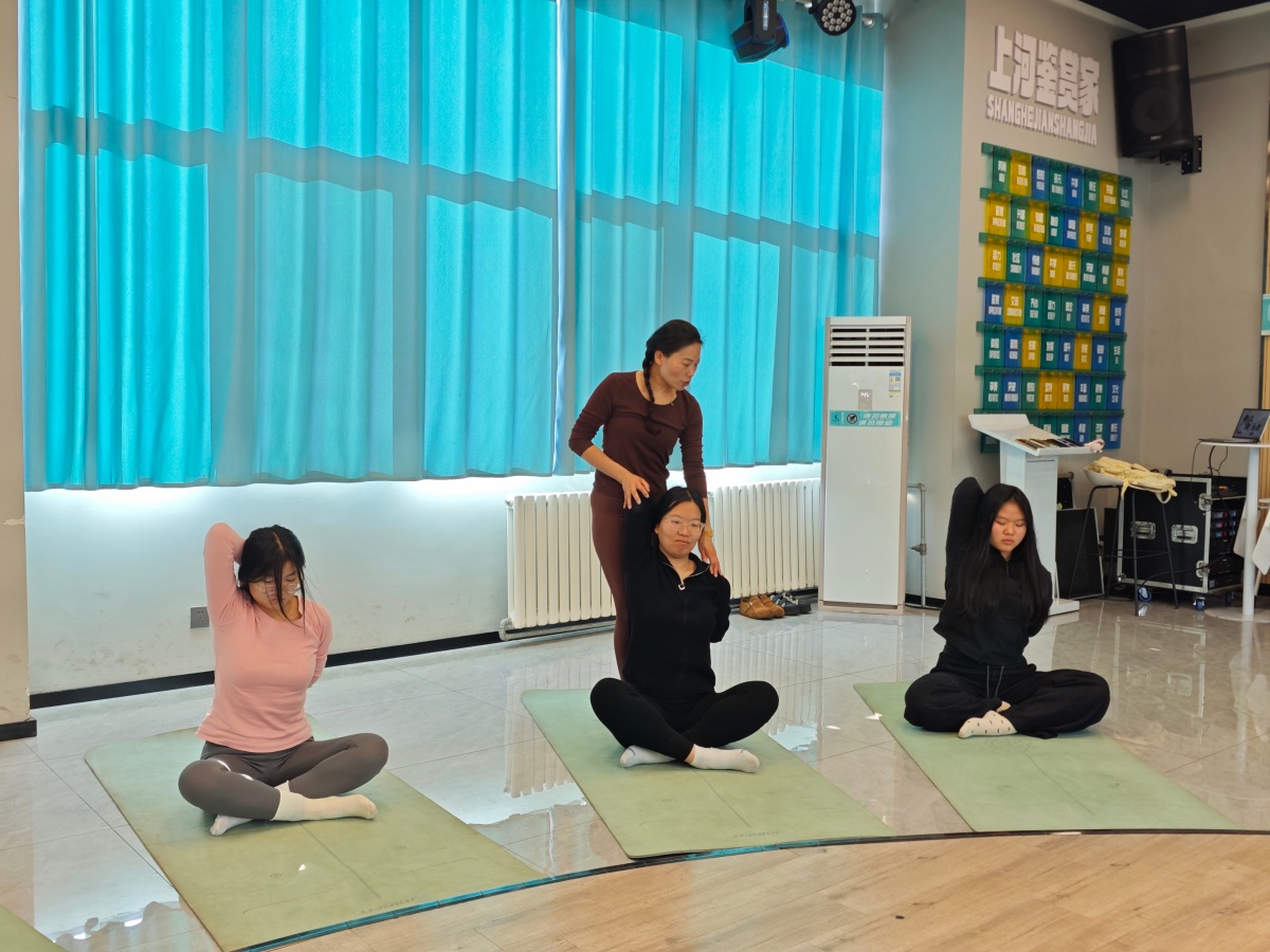 最后5分钟的冥想环节,剧场灯光柔缓暗下,流水白噪音漫开。同学们平躺在垫上,刘老师的声音轻而稳:“把注意力放在呼吸上,吸气时肚子轻轻鼓起,呼气时肩膀往垫子沉……”场间彻底静了,能隐约听见均匀的呼吸声——连日忙攒在肩颈里的紧绷,轻轻揉开了。