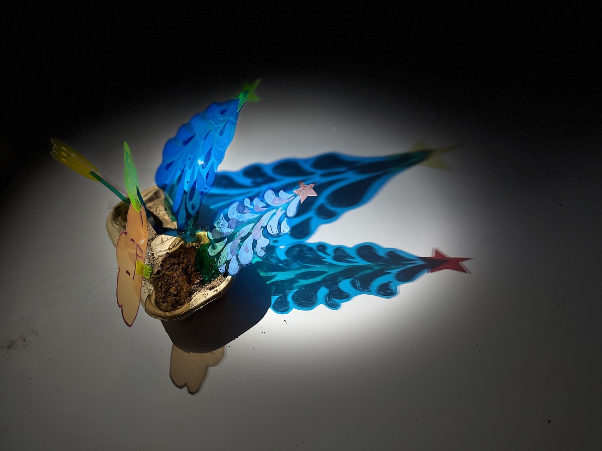 当透明玻璃纸遇见定向光源,一场关于自然与光影的对话悄然展开。我们以泥土为根,以玻璃纸为媒,剪裁出羽叶、繁花与童趣轮廓,让平凡材料在光的照射下生长出诗意。半透明的枝叶与花瓣扎根泥土,向着光舒展轻盈姿态,在墙面投射出斑斓灵动的光影,将自然的呼吸、生命的律动凝练成可视的视觉诗篇。