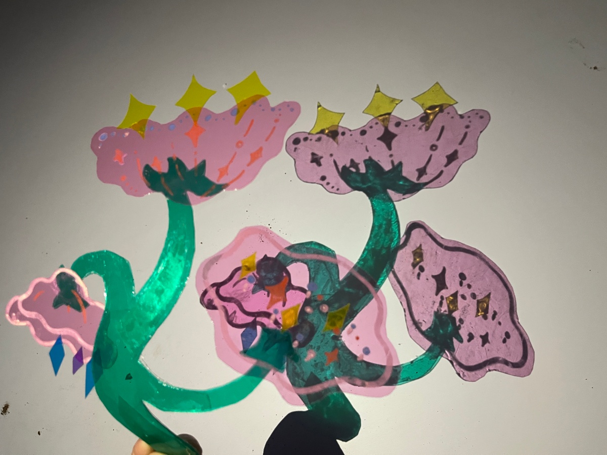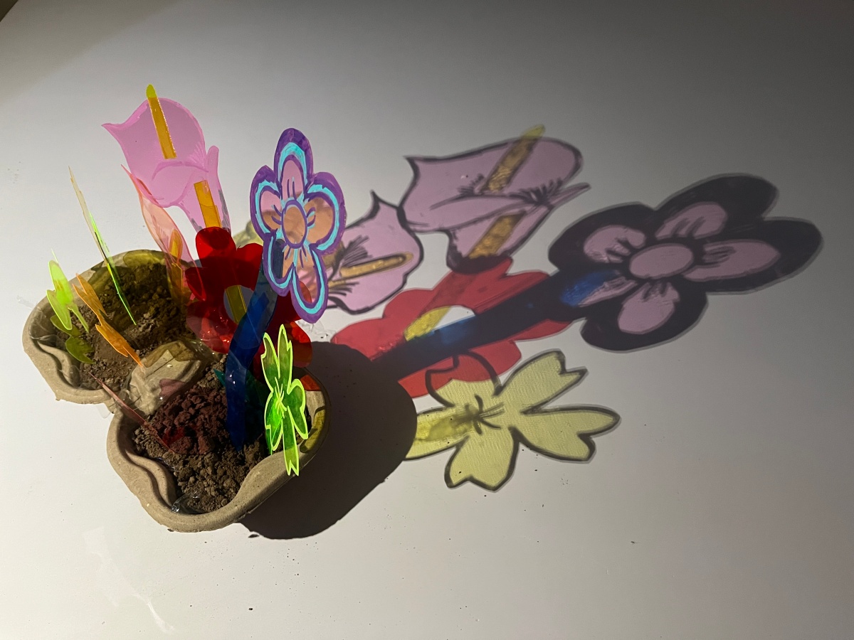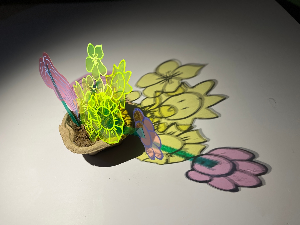 用多彩玻璃纸剪裁出形态各异的花朵——粉紫的马蹄莲、橙红的重瓣花、荧光绿的叶片,在光源下不同色彩的花瓣相互叠映,在墙面织就一张斑斓的花影梦境。泥土容器承载着自然的本真,透明玻璃纸则是梦幻的载体,寓意生活的美好与诗意,如同这些光影般,在平凡日常里被温柔唤醒,层层交织成充满生机的理想图景。