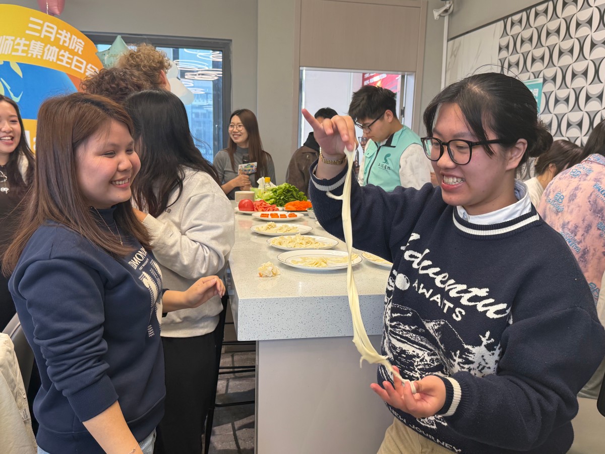 压轴登场的中国长寿面,一根长面条承载着“平安长寿”的美好祈愿,“吃了这碗面,平安又长寿”的祝福响彻全场。中外师生围坐一桌,一口德国土豆球,一口中国长寿面,用各自民族的传统方式,为寿星们送上最真挚的“环球祝福”。这一刻,没有语言的屏障,只有美食带来的、最纯粹的“国际快乐”!