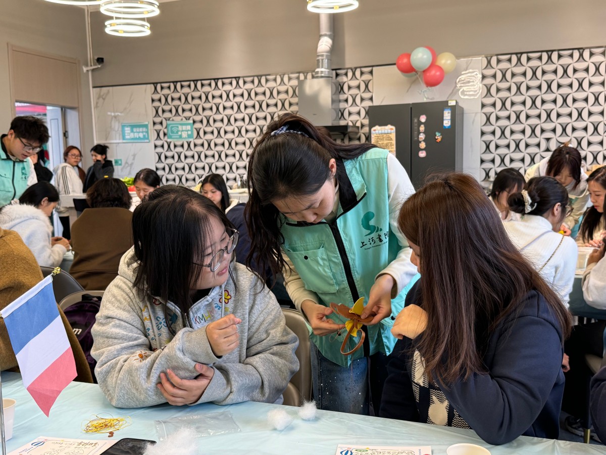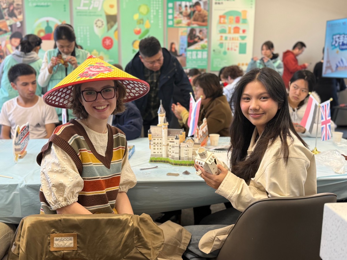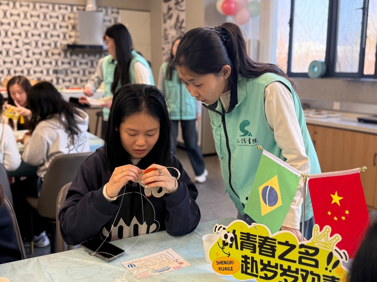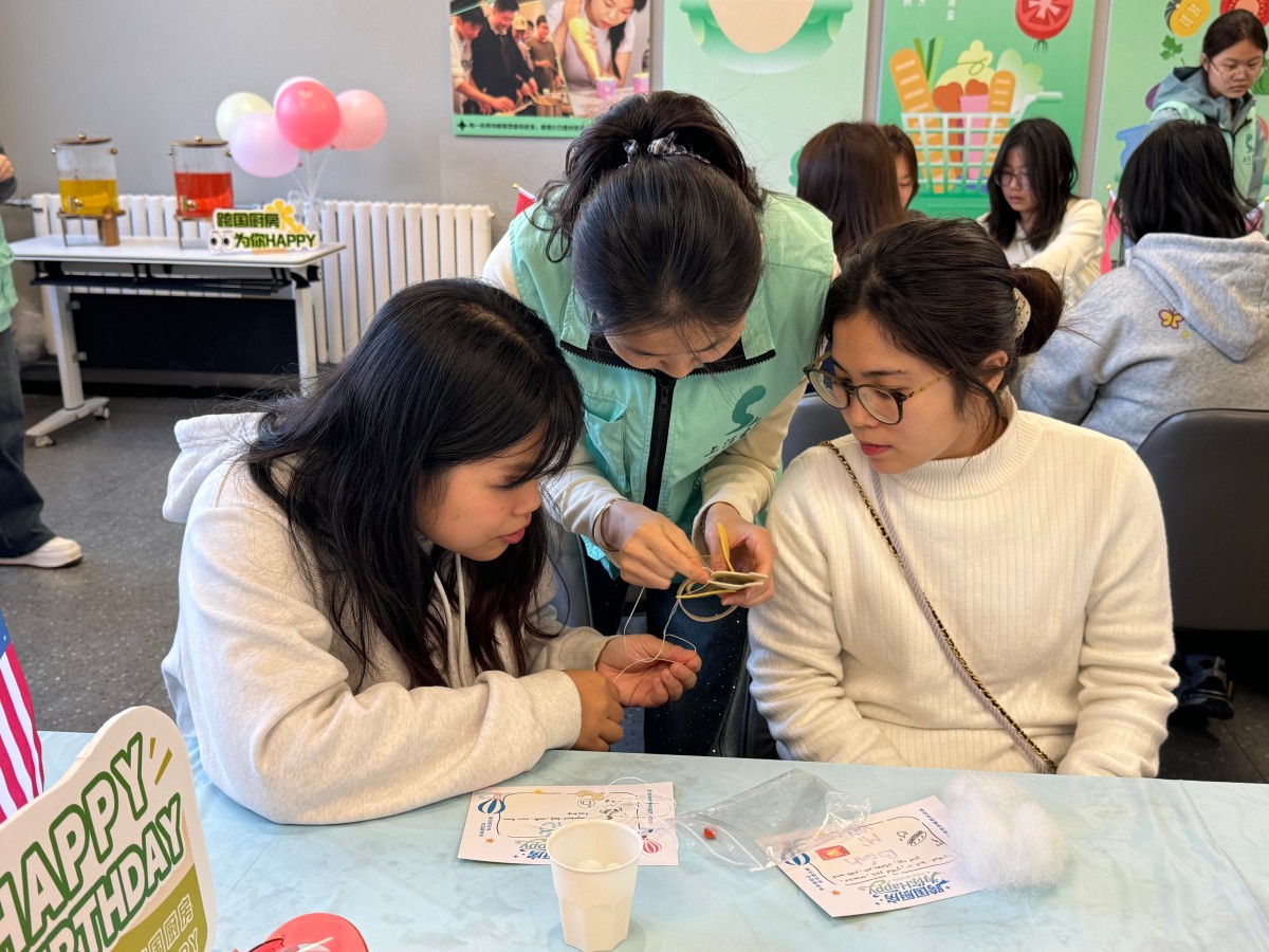 在“福禄葫芦中国风区”,中国同学化身“非遗小老师”,红绳绿线在指尖灵巧穿梭,吉祥的葫芦渐渐成型,每一缕绳结都编织着中式祝福。隔壁的“小象皮具泰式工坊”,泰国留学生变身“缝纫大师”,针脚细密,憨态可掬的小象跃然皮上,泰式灵巧藏在每一针里。“新天鹅堡德国积木角”散落着彩色梦想,德国小伙伴带领大家搭建童话城堡,严谨中透着浪漫;“越南风情草帽编织站”里,竹编与彩线共舞,越南同学的精巧手艺让草帽变身热带风情礼物。一声声用不同语言说出的“生日快乐”,织进了比阳光还暖的“跨国友谊温度”!