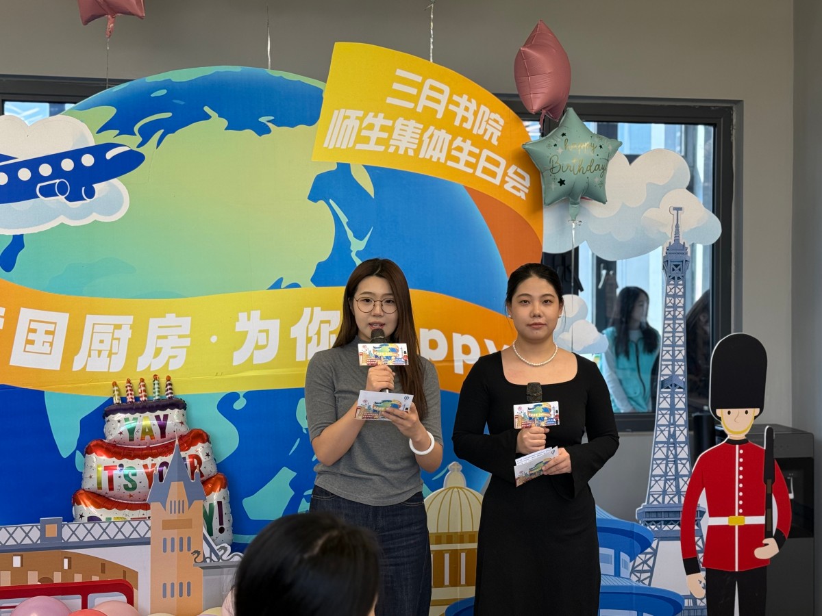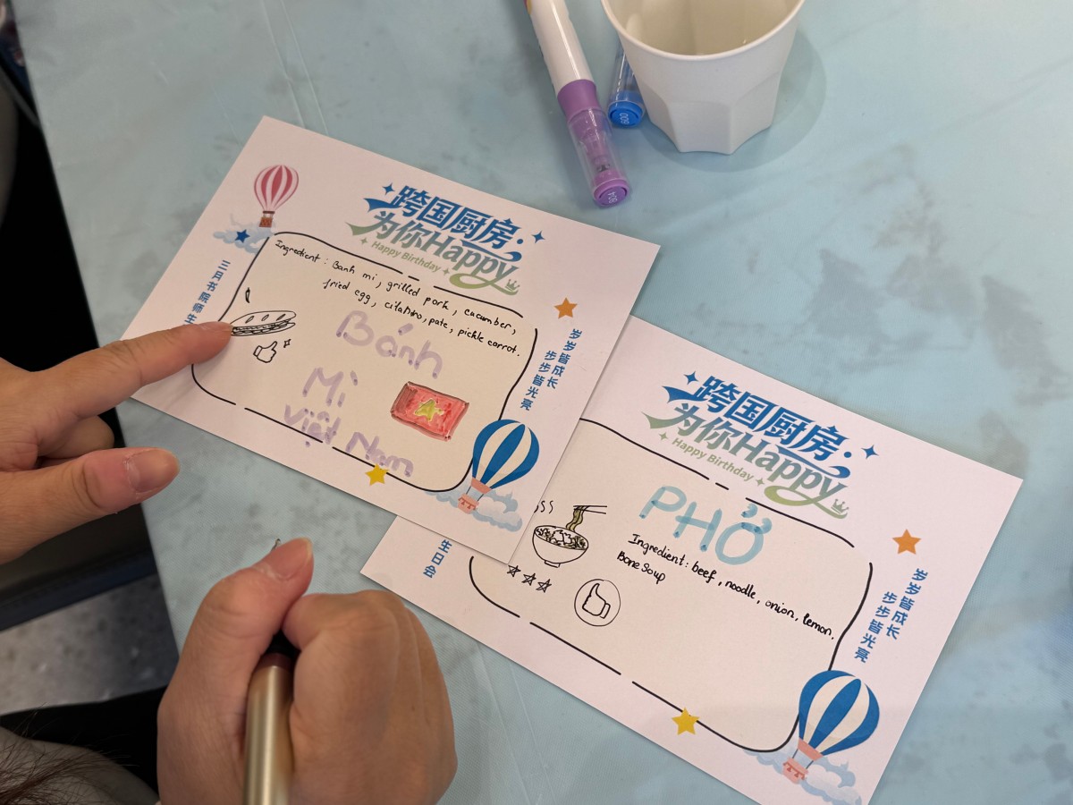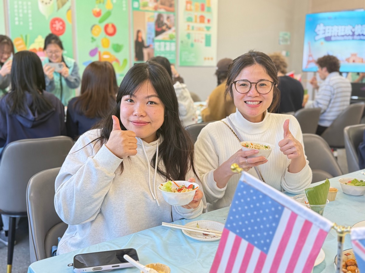 双语主持于叶璠老师和王馨娣老师的声音响起,生日祝福以“四国接力”的方式温情上演:德国留学生端上圆滚滚的德式香肠土豆,用略带口音但无比真诚的中文说:“这个代表圆满,祝大家每天都开心圆满!”;泰国师生奉上酸辣鲜爽的泰式檬粉:“我们的生日面,酸是惊喜,辣是热情,统统送给你!”;越南伙伴现场教学越式春卷:“把好吃的包进去,就像把所有好运都卷给你!”