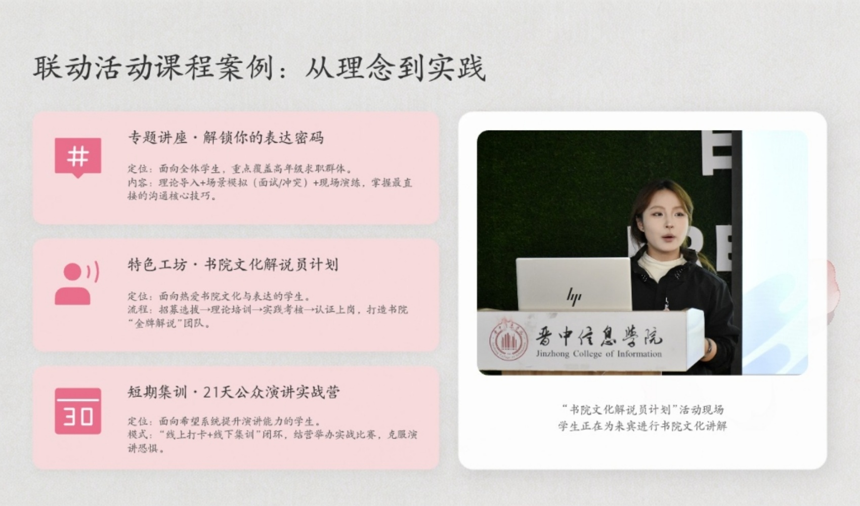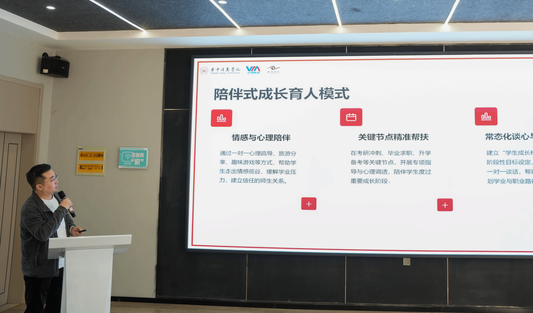 杏花书院全生异科导师代表张恺翔老师围绕书院“表达力”育人核心详细介绍本书院“解说员计划”、“21天表达力成长训练营”等特色品牌活动。书院异科导师团队共同确定将专题课程、项目工坊、短期技能训练营作为三大切入点,重点推进“7天BP速成营”与“21天演讲实战营”两大核心项目,同时聚焦高年级学生求职面试的核心痛点,采用线上线下闭环联动模式,多措并举全面提升学生的语言表达能力与职场适配素养,使学生在成长与求职路上稳步前行。