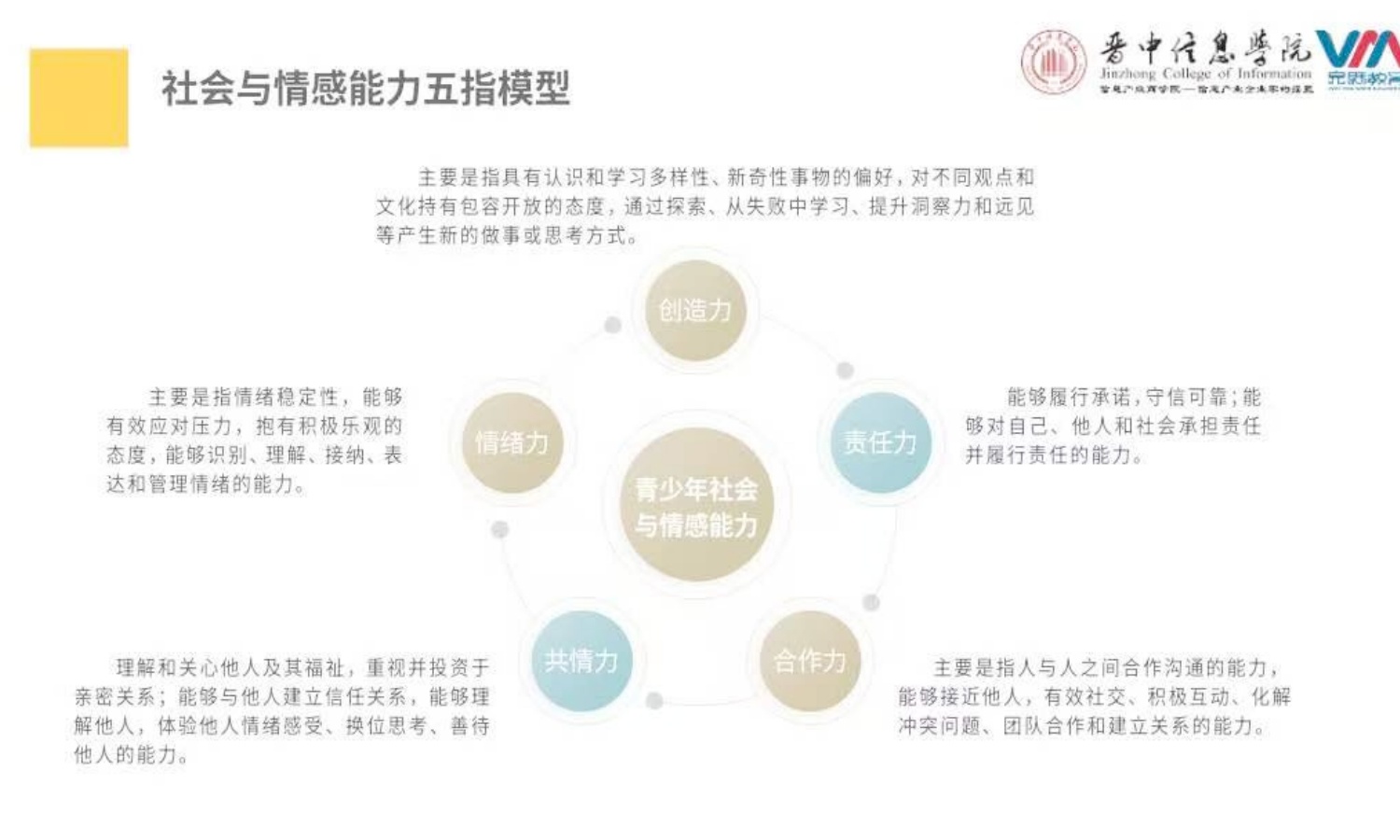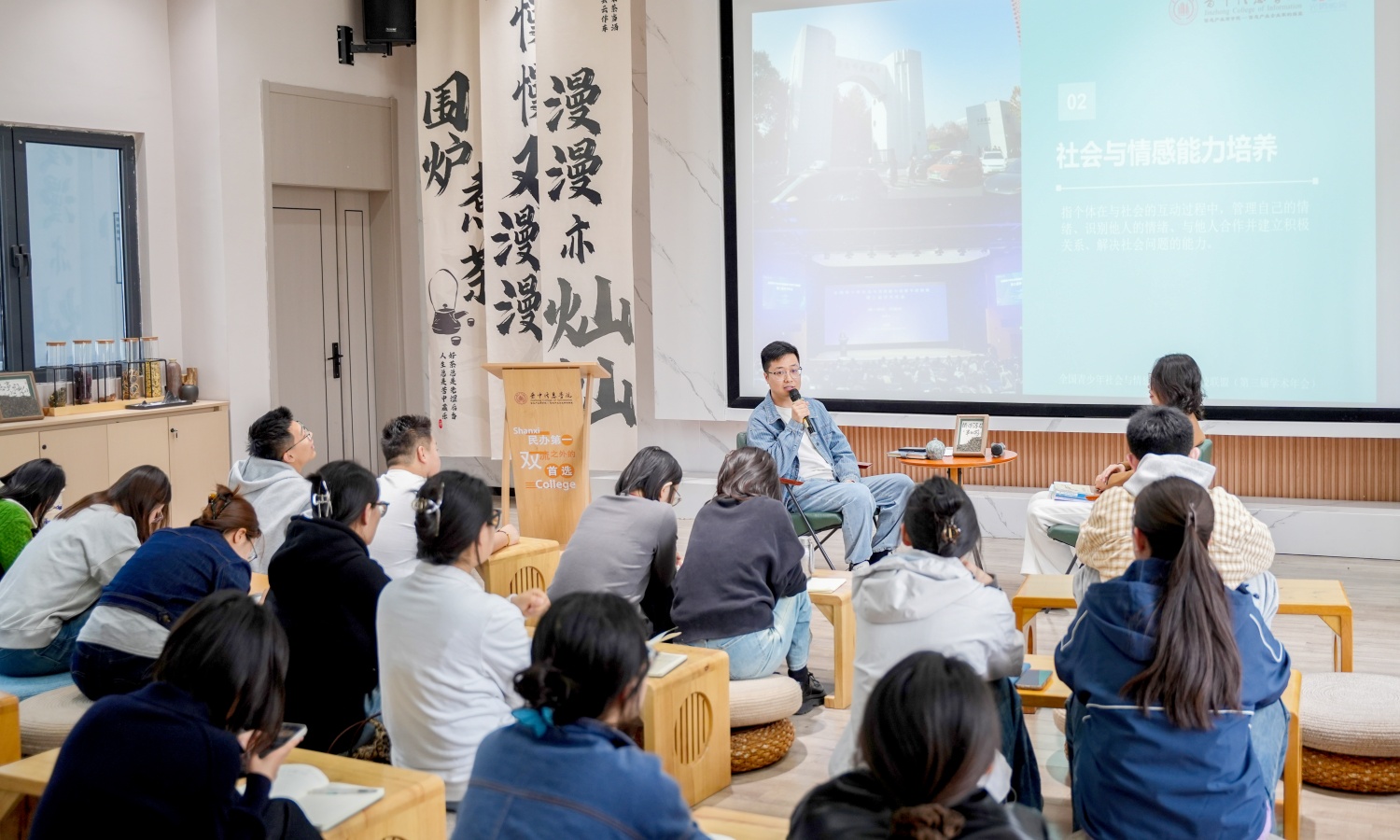 贾力老师围绕“社会与情感能力培养”主题展开深度解读,重点讲解了社会与情感能力“五指模型”,清晰阐释情绪力、共情力、合作力、责任力、创造力五大核心能力的内涵与特征。结合大学生成长阶段的特点,他提出了分层分类的三级育人体系框架,并梳理出课堂实践、学校变革、家校社协同的三维实践路径,让在场老师明确了社会情感能力与书院社区领导力培育的内在关联,以及具体的落地方向。