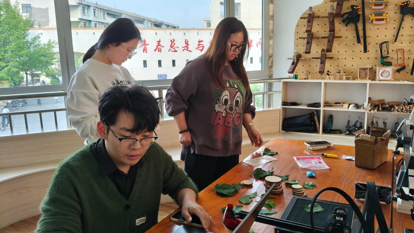 告别自然园艺区,同学们步入匠心手作站。鲁班·木艺工坊的“木易疗愈坊”内,同学们挑选完整叶片,在叶面勾画图案后交由机器精细雕刻,刻刀沿叶脉游走,线条与纹理交织成独特的艺术印记。完成雕刻后,大家又挑战拆装鲁班锁,在榫卯结构的严丝合缝中感悟传统木艺的智慧。旁边的菁英“炼”习生工作室“暖绒补给站”则是另一番温暖景象:羊毛毡在戳针下慢慢塑形,变成可爱的钥匙扣或挂件。玛钢·筑梦工坊中,细铁丝在同学们的指尖弯折、缠绕、塑形,冰冷的金属在指尖化作柔美的造型,每一件都独一无二。从叶片到羊毛,从铁丝到石膏,每一件作品的诞生都离不开双手的反复打磨,这正是劳动教育最生动的课堂。