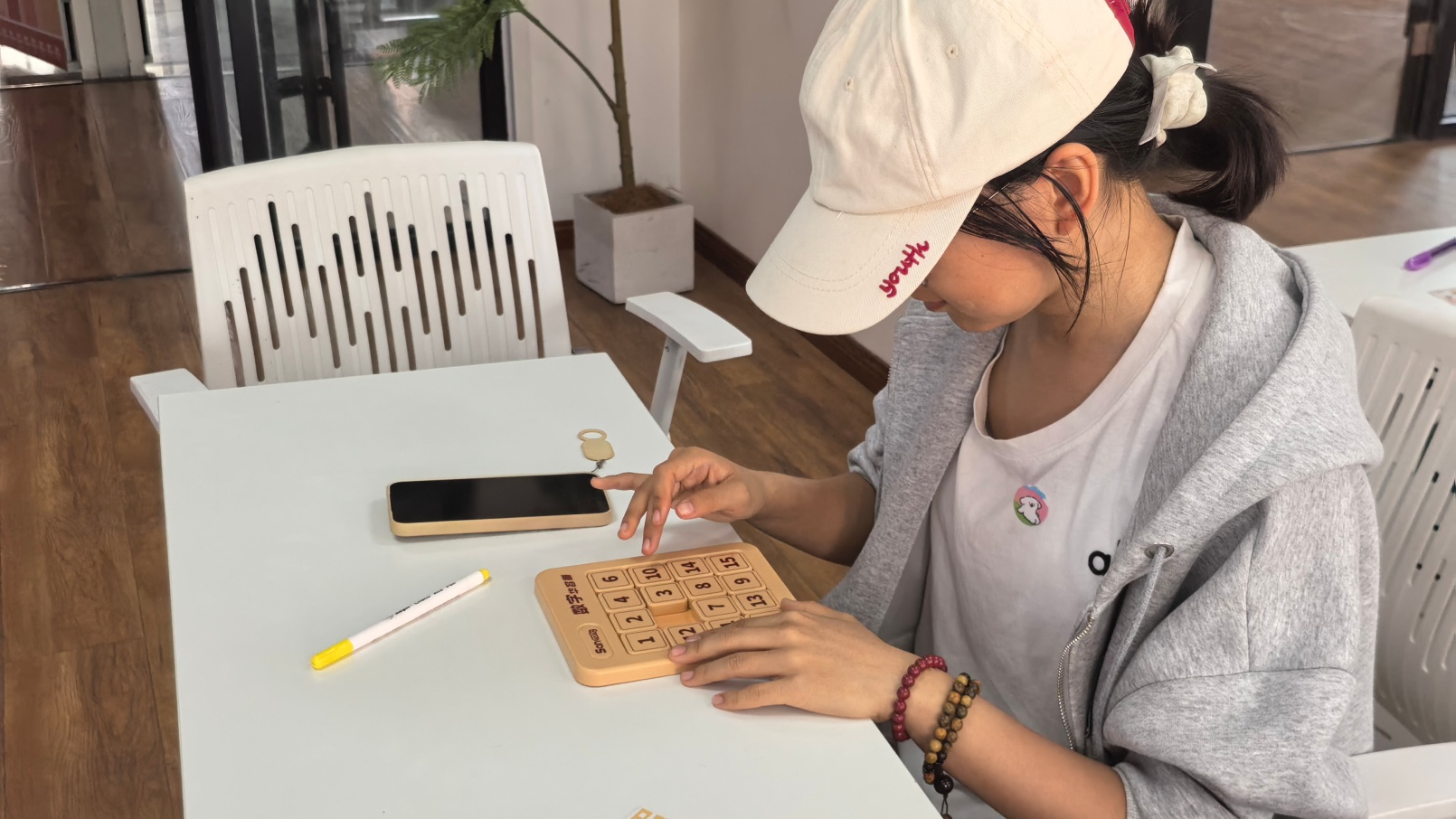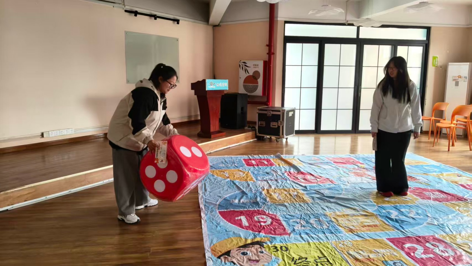 劳动不仅需要巧手,更需要智慧的碰撞。数字无边工坊的“智能系统站”里,同学们三四人一组,面对二进制谜题展开头脑风暴,成功破解“核心密码”时全组欢呼,这是集体劳动的智力成果。一旁的华容道挑战同样吸引众人,推挪滑块,在方寸之间为“曹操”寻找出路,每一次移动都是空间思维与耐心的双重锻炼。而玩创职场工作室的“闯关大富翁”则将劳动与游戏结合:掷骰子走格,完成蹲起等体力任务,欢笑中抵达终点。无论是逻辑推演还是体力挑战,同学们都在协作中体会到劳动是群策群力的共同奔赴。