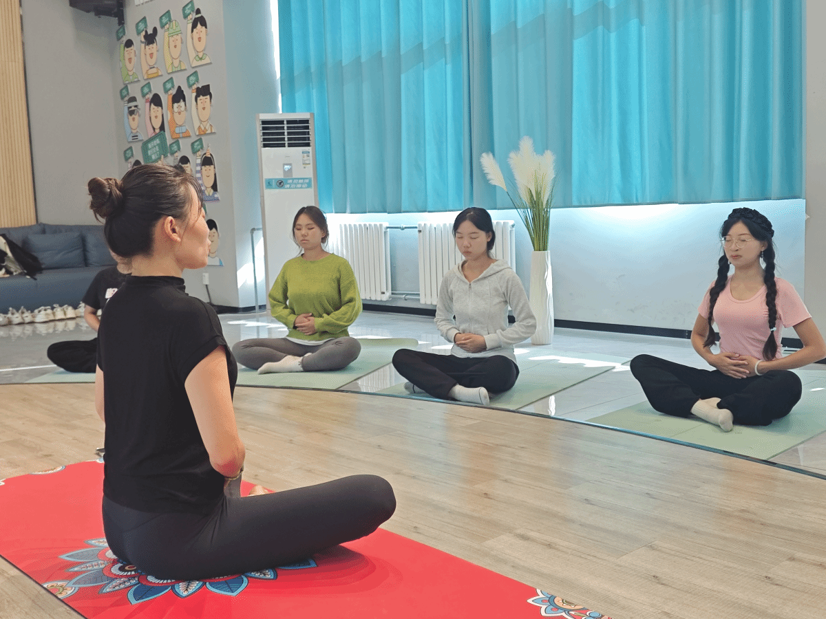 活动伊始,在刘红霞老师轻柔的引导声中,学员们缓缓闭上双眼,进入冥想环节。“感受你的呼吸,吸气,将新学期的期待与能量纳入身体;呼气,将所有的紧张与不安全然释放……”空气仿佛随之静止,只余下均匀的呼吸声起伏。从纷繁的课业与社交中暂时抽离,学员们仿佛为精神世界按下“暂停键”,在这段专属于自己的十分钟里,有人眉头渐舒,有人嘴角微扬,学员们在此刻专注于自我内在的对话,完成了一次深度的精神“重启”,为接下来的体式练习储备了纯净的身心能量。