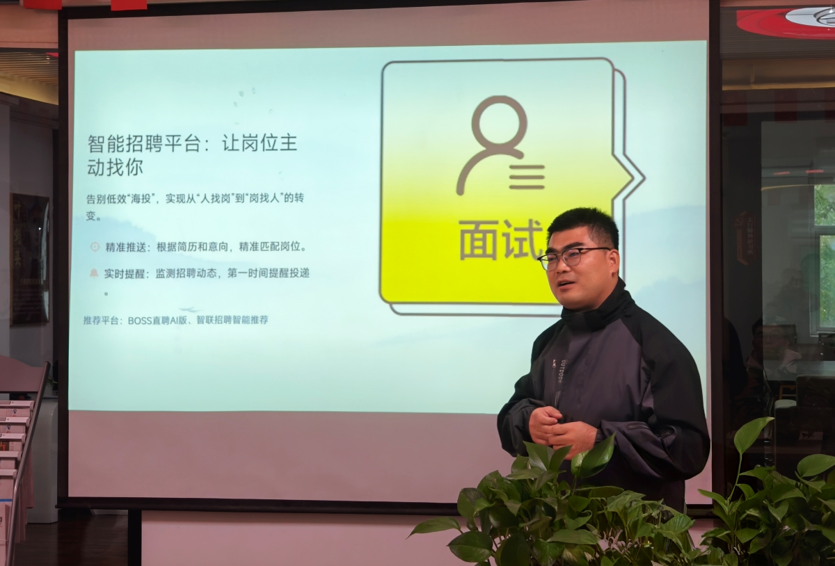 围绕AI时代的个人成长路径,张老师提出“工具赋能+实战锤炼”的双轨模式。在学习层面,他建议同学们善用AI学习平台,实现个性化课程推送,通过智能错题本精准复习,并借助AI思维导图构建系统化知识结构。在实践层面,张老师介绍了智能招聘平台如何实现从“人找岗”到“岗找人”的转变,推荐了BOSS直聘AI版、智联招聘智能推荐等工具,帮助同学们高效匹配岗位、实时获取招聘信息。此外,他还鼓励大家利用AI优化简历、模拟面试,并拓展行业人脉,构建数字化求职竞争力。