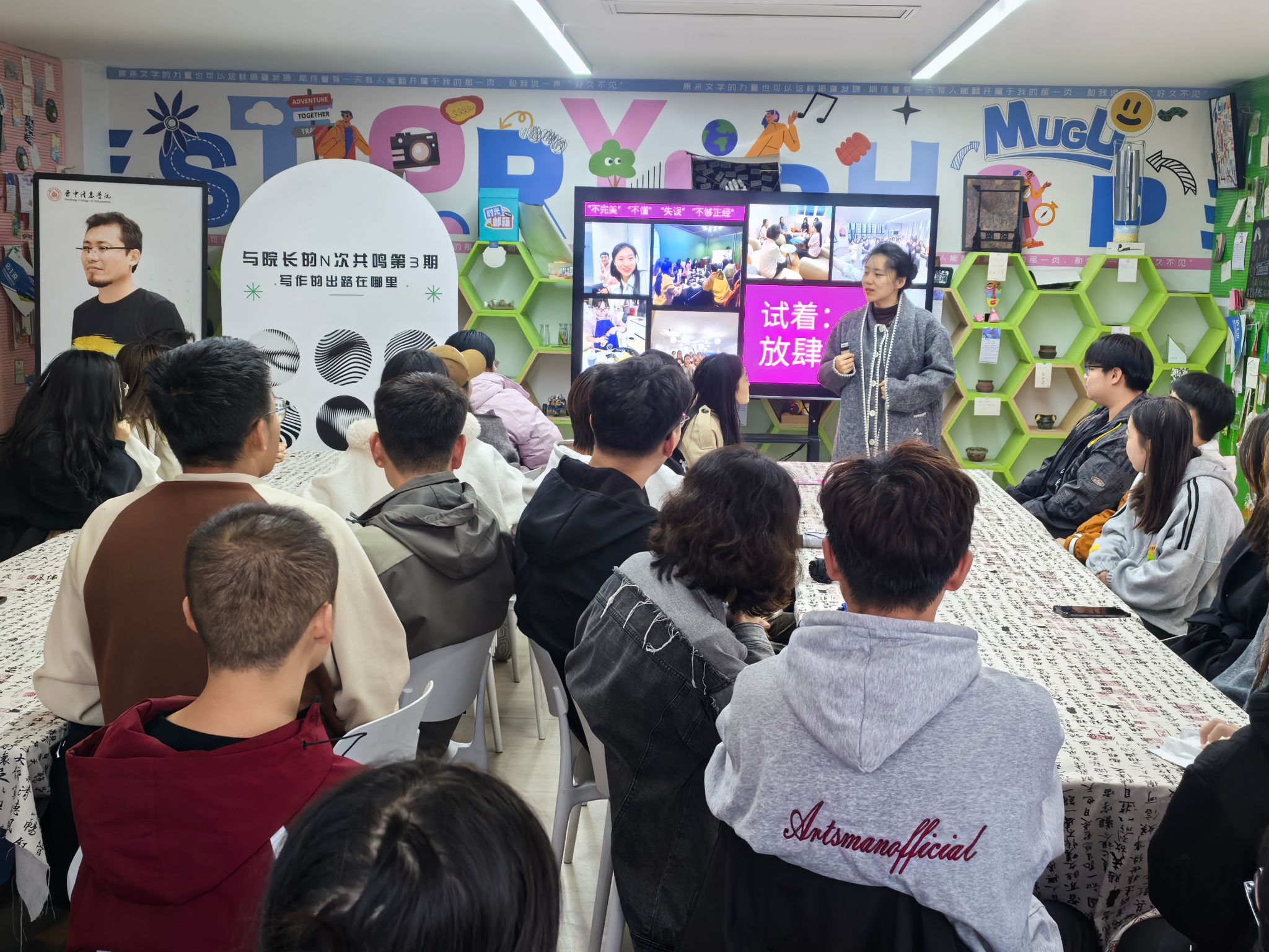 长长的桌子拉近了彼此的距离,墙上色彩斑斓的涂鸦与装饰充满了青春气息。“松弛感”“要尝试”“朋友!请放肆地野蛮生长”等关键词不断闪现,精准地捕捉了同学们普遍关注的内心议题。