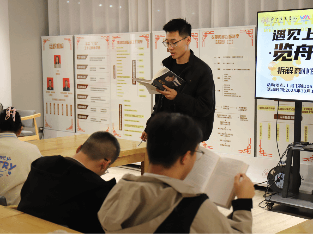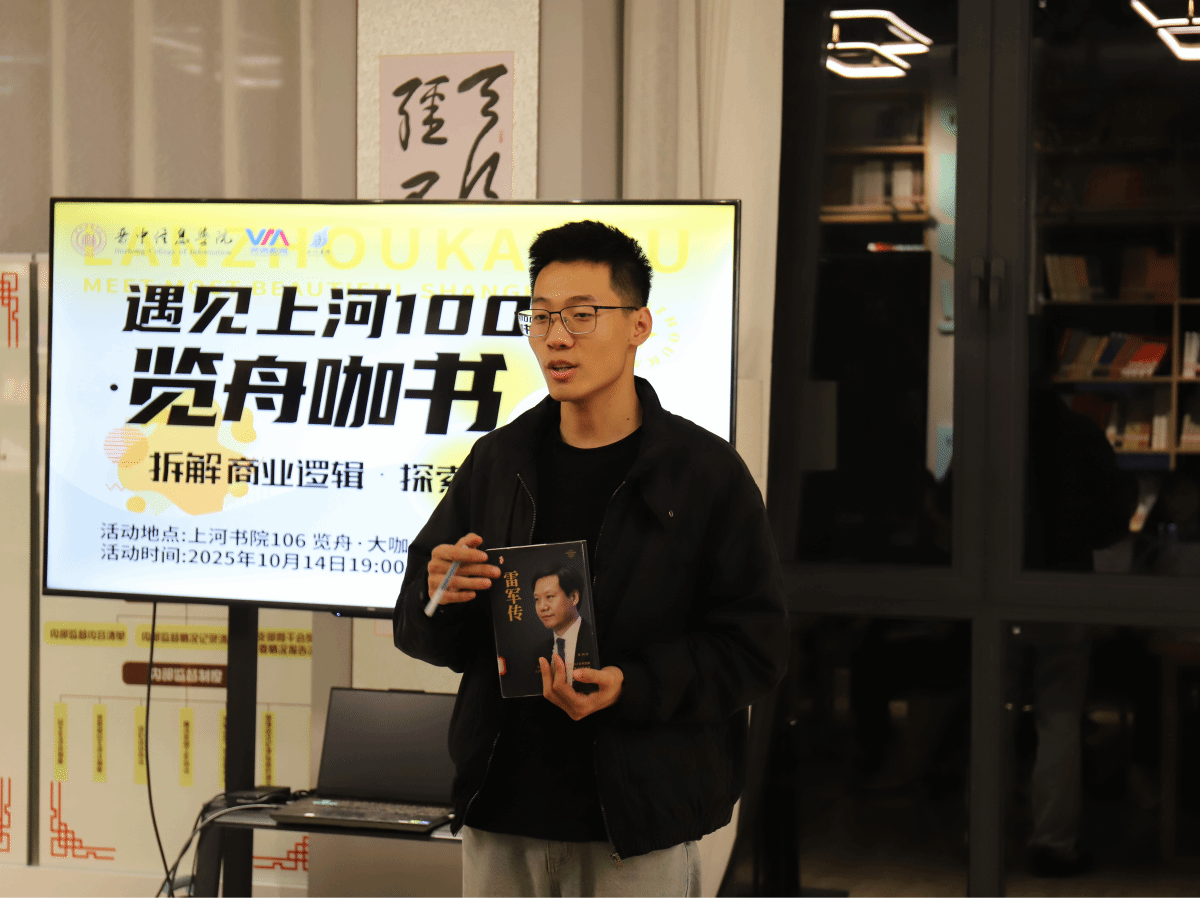 当名人案例照进青年成长,当商业逻辑碰撞校园思维。10月14日19:00,“遇见上河100+·览舟咖书(第62期):拆解商业逻辑·探索创新密码”活动在106 览舟·大咖书屋悄然开启。活动聚焦于记录时代企业家奋斗历程的《雷军传》,通过“品读-观影-精讲-分享”的递进式学习模式,为同学们带来了一场极具启发的思想盛宴。