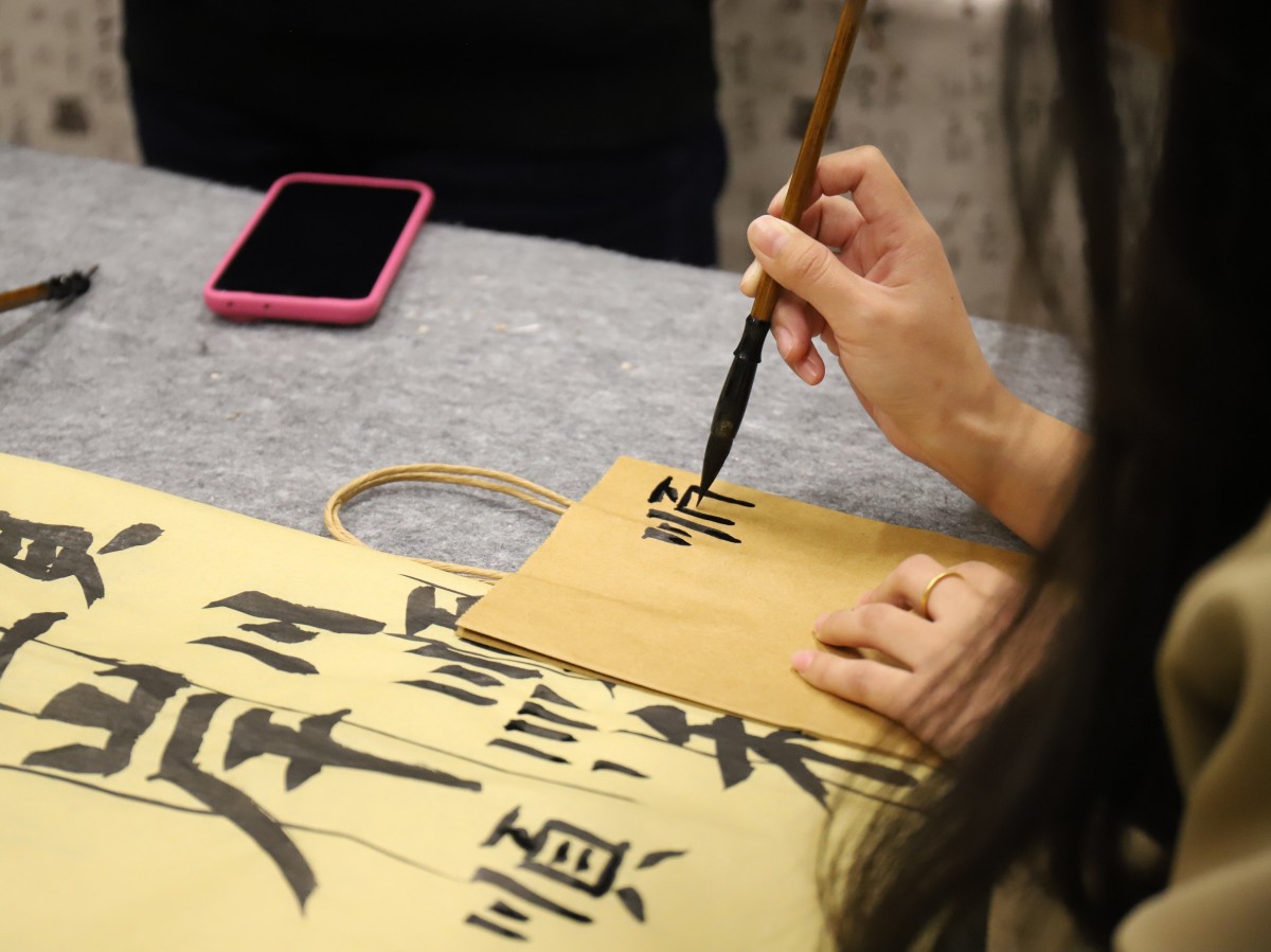 待掌握基本技法后,参加者将练习成果展现在牛皮纸袋上,将美好祝愿与真诚期盼融入每一笔每一画之中。从毛边纸的反复练习到牛皮纸袋的最终创作,这一过程不仅让同学们体会到书法需要循序渐进的真谛,更让普通的牛皮纸袋承载了特殊的意义。方寸牛皮纸袋,记录的不仅是浓淡相宜的墨迹,更是同学们对未来的深切期许与当下的静心修行。活动现场墨香四溢,气氛温馨,参加者们在点画折转间感受汉字之美,在提笔落墨中体会书写之趣。