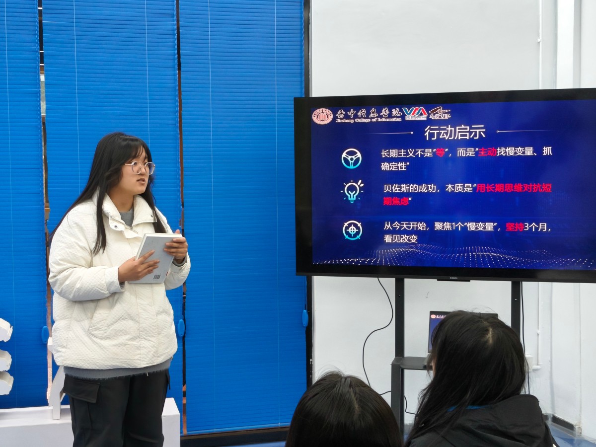 在活动的尾声,付莉媛老师概括道:“长期主义不是‘等待’,而是‘主动寻找慢变量、抓住确定性’。” 贝佐斯的成功启示我们,真正的智慧在于识别那些缓慢但持续创造价值的因素,并持之以恒地投入。最后,付莉媛老师上台对本次的活动进行了全方面的总结,并祝愿同学们找到属于自己的节奏和方向,奔向更好的自己。