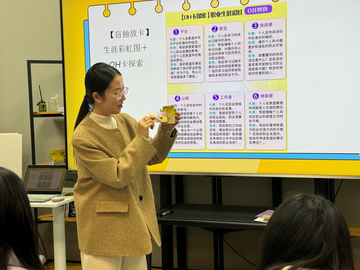 在互动与分享环节,同学们积极提出关于未来的困惑与现实中遇到的困境。同学们踊跃走上前,展示自己的“生命彩虹”和OH卡牌,讲述自己对其理解的故事和感悟。有人在家庭角色的描绘中,感悟到亲情的羁绊与力量;有人在学业角色的梳理中,明确了未来的专业深耕方向;还有人在对未来职场角色的畅想中,找到了当下努力的动力。刘老师耐心倾听,并逐一给予专业而温暖的解答,帮助大家拨开迷雾,坚定信念,鼓励学生主动摆脱负面情绪,以阳光、乐观的态度拥抱未来的无限可能。