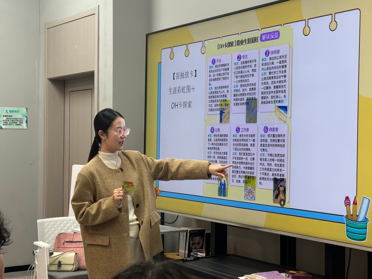 活动伊始,刘老师用一个轻松有趣的问题——“你在社会中扮演什么角色?”作为预热,迅速拉近了与学生的距离。随后,同学们在刘老师的引导下,使用“生命彩虹图”和OH卡牌两种专业的生涯规划工具,梳理自己在不同人生阶段扮演的角色,从家庭中的子女到校园里的学生,再到未来职场的从业者等,每一个角色的出现年岁与价值权重,都被细细勾勒在“彩虹”图谱上。这一过程不仅帮助学生更清晰地认识自我,也促使他们反思原生家庭与个人价值观对人生选择的影响,从而对未来的学习、职业与生活形成初步的规划与准备。大家在纸上涂绘着属于自己的“生命彩虹”,色彩的浓淡、线条的长短,都藏着对人生的期许与思考。