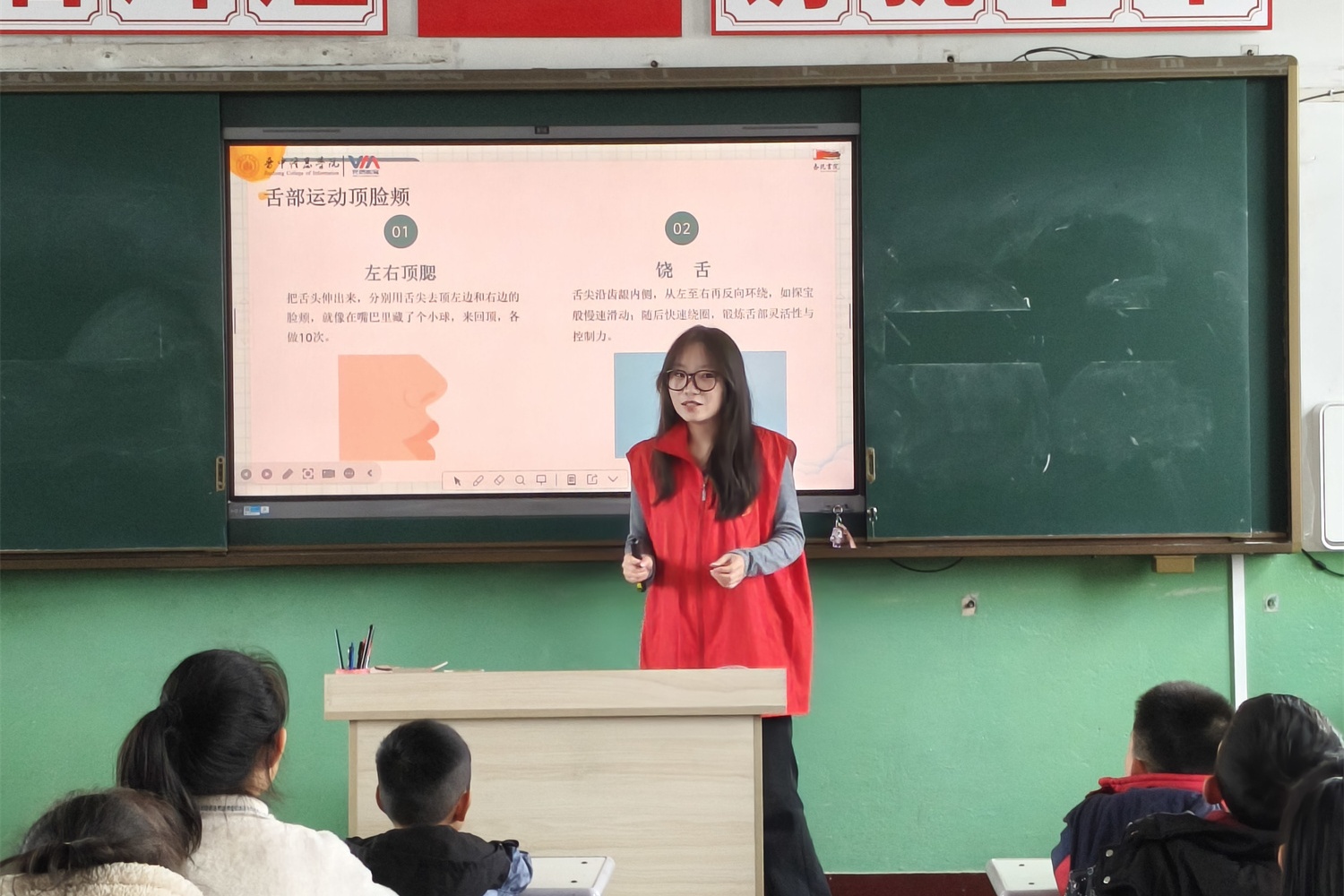 训练好发声基础是大胆表达的第一步,志愿者贾子沫以充满活力的口播操拉开序幕。“搓搓小脸提精神,颧肌上扬笑盈盈,舌尖顶上腭,力量练不停”志愿者一边喊着口令,一边带领孩子们进行搓脸提神、提颧肌练微笑发声、顶舌锻炼等系列动作,随后还加入“快吸慢呼”的气息调整练习。