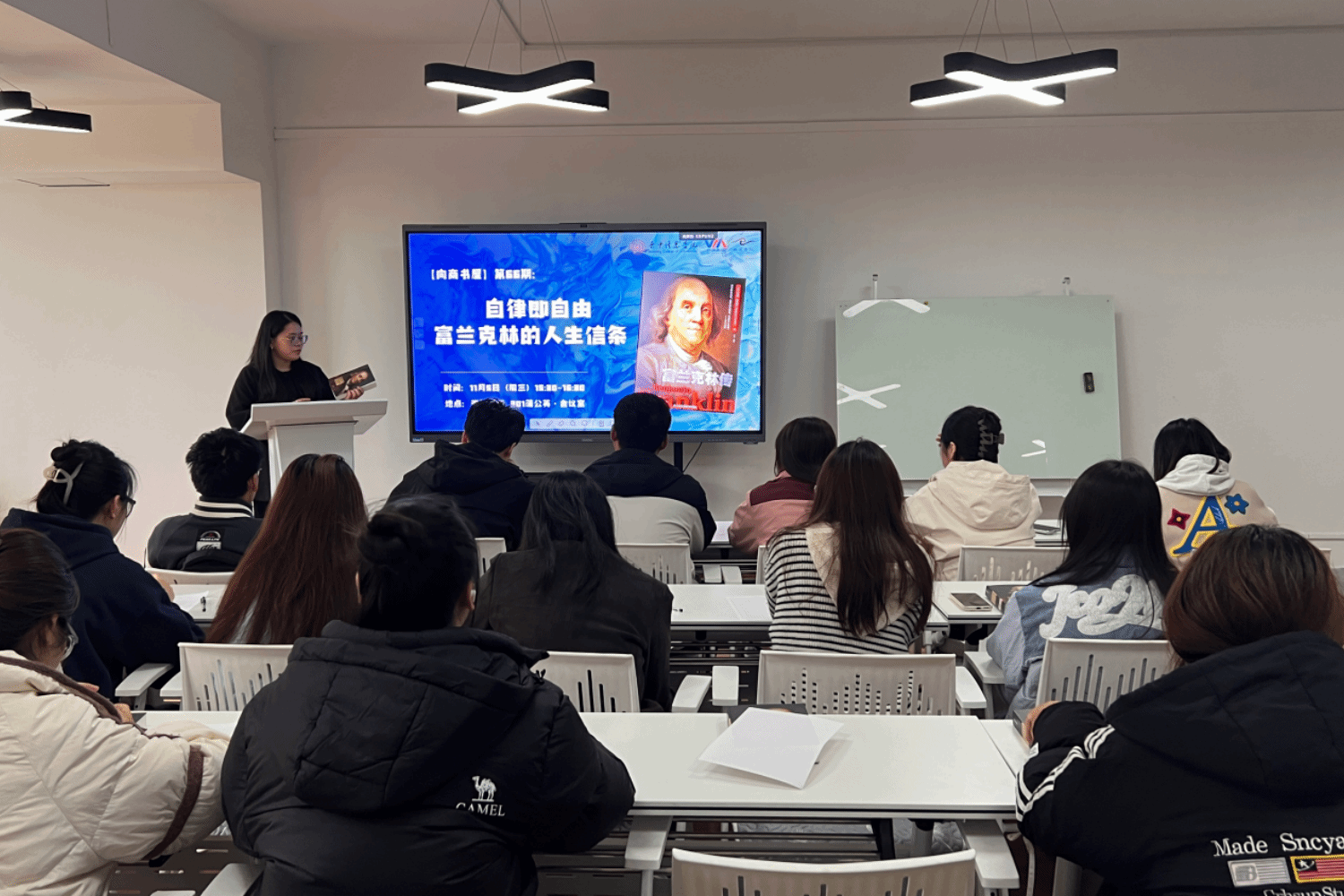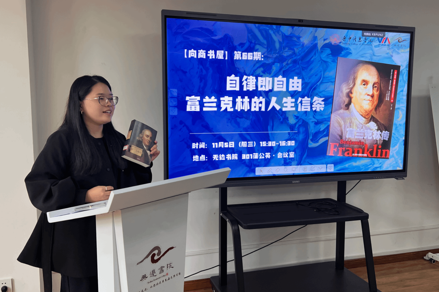 11月5日15:30,无边书院于301蒲公英·会议室举办了【向商书屋】第66期:自律即自由·富兰克林的人生信条。本次活动以书籍为媒,从解读到互动,无边书院发展导师秦鸿业带领同学们走进富兰克林的理性世界,探寻“自律”背后那份从容与自由。
