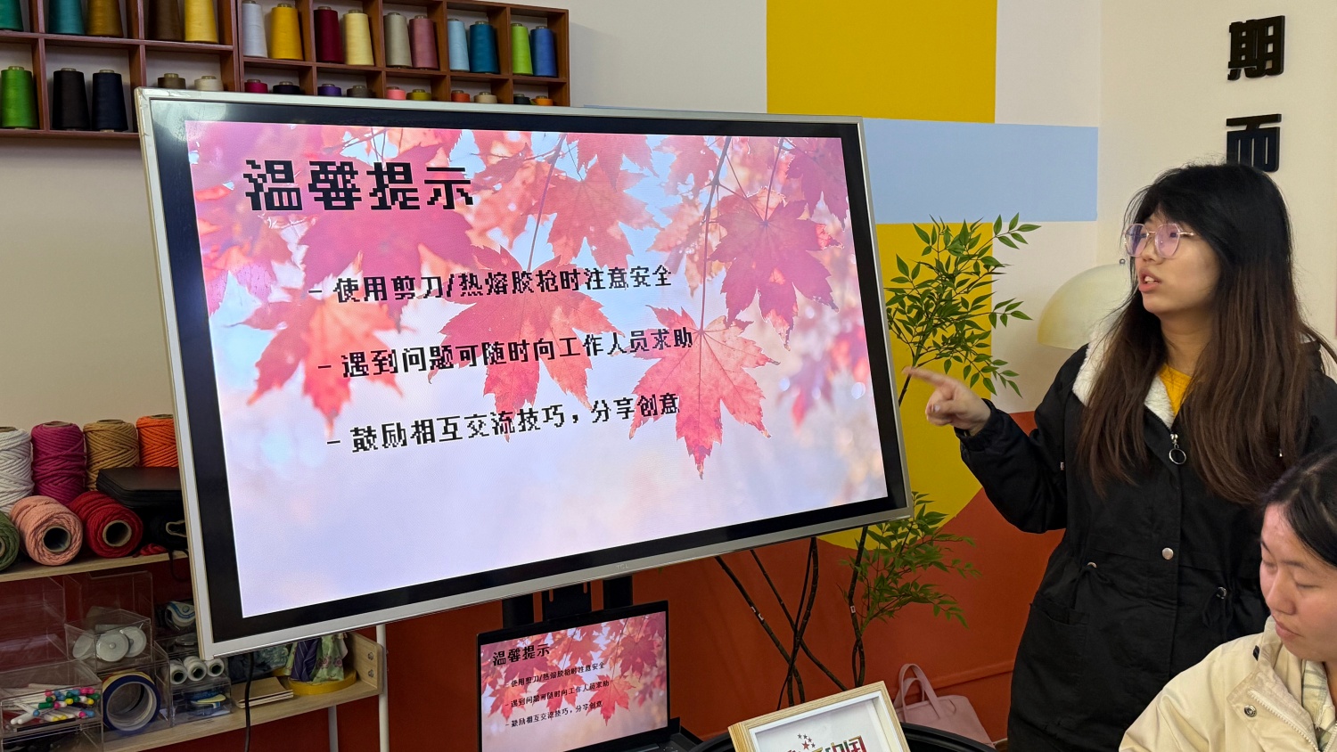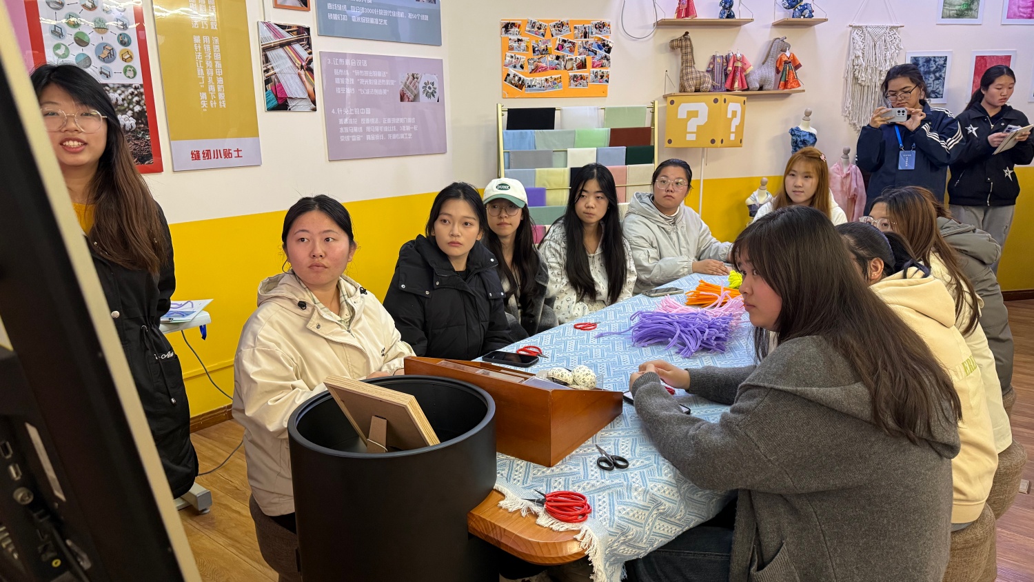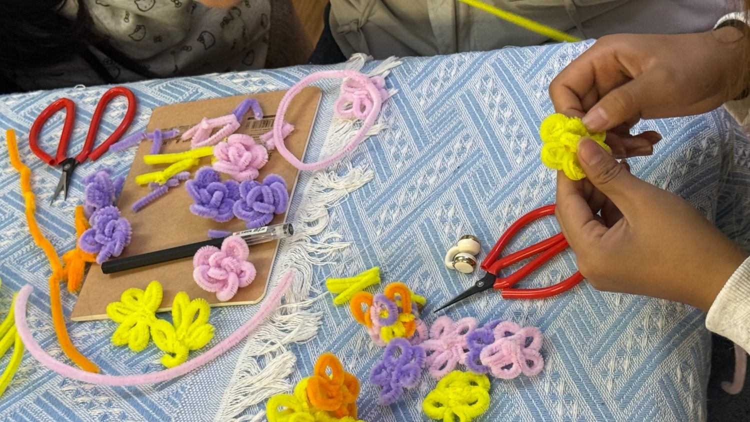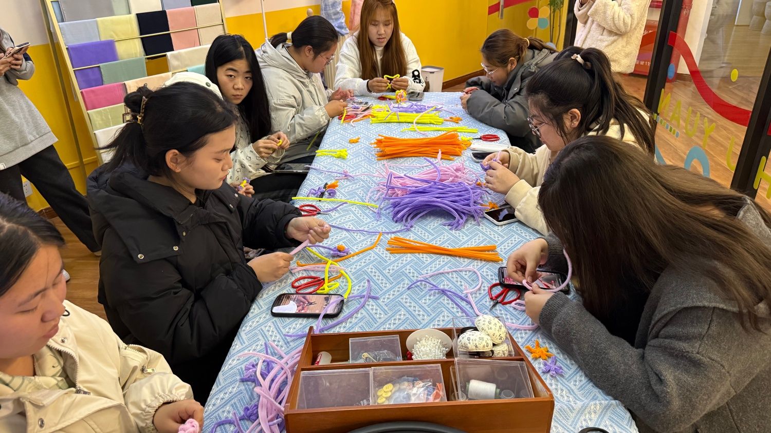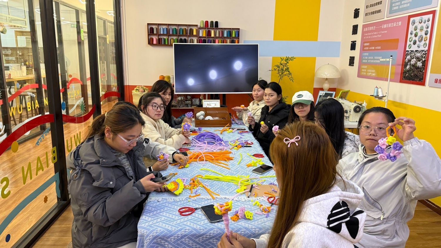 那是11月12日的傍晚,我走进203木棉·布艺工坊,瞬间被满桌的色彩拥抱。紫、黄、棕、粉的扭扭棒像一道温柔的彩虹,整齐地躺在浅色桌布上。空气中漂浮着隐约的期待,墙上往届的手工作品照片,更是点燃了我的创作渴望。