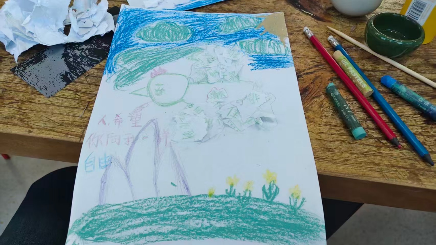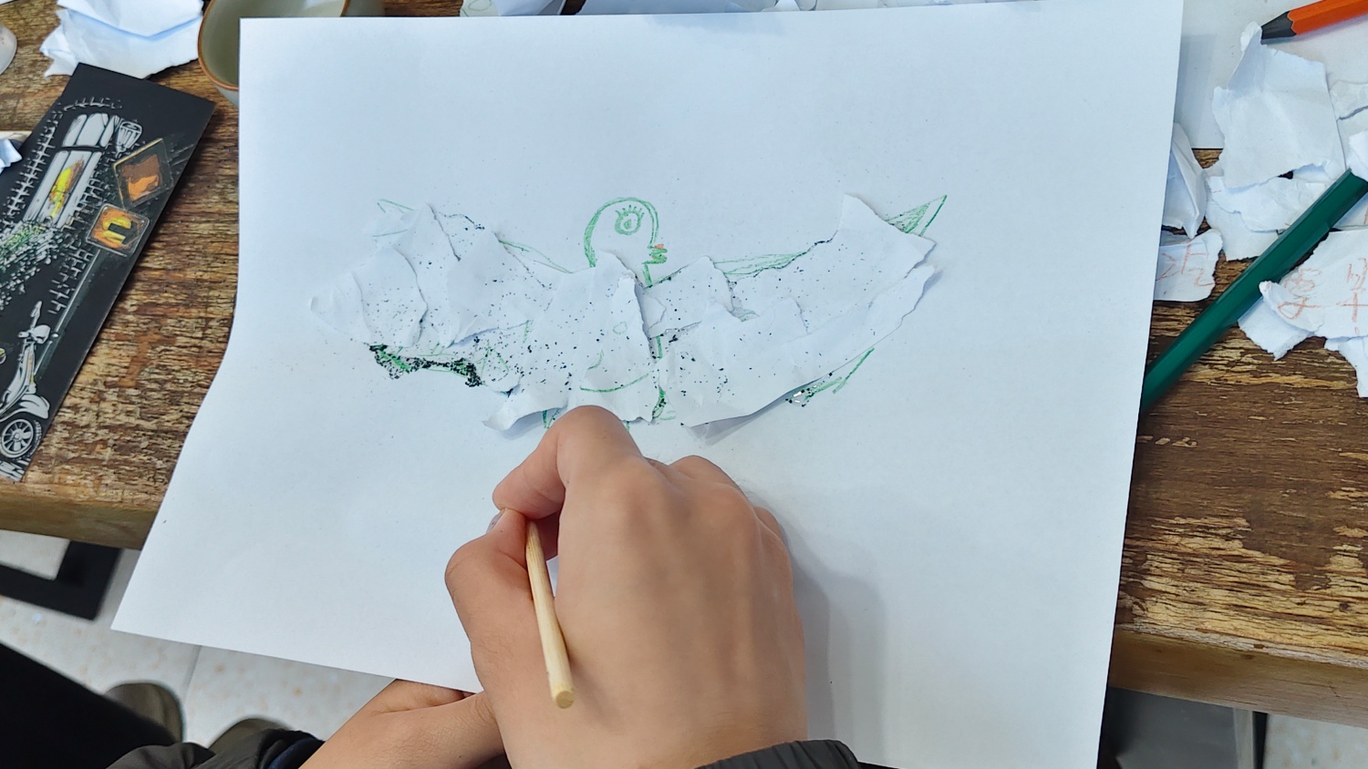 “现在把它揉成你最讨厌的样子。”我用力攥紧,指节泛白时竟不自觉地笑了。原来把烦恼具象化然后捏碎,是如此痛快。满室的撕纸声窸窣作响,像集体卸下重担的仪式。碎纸片落在掌心时,我仿佛抖落了一身的疲惫。旁边女生小声说:“好像把这周的焦虑都撕没了。” “画一只你心里的鸟,不用像,像你自己就行。”我画了只翅膀张得很大的歪扭小鸟,它看起来倔强又渴望飞翔。老师递来胶棒:“把刚才的碎片贴在它身上,那些沉重,会变成托着你飞的羽毛。”我把沾了茶渍的纸片仔细粘在鸟翅膀上,突然间懂了:那些让我喘不过气的情绪,从来不是包袱,而是能让我飞得更稳的凭依。阳光落在这些“羽毛”上,纸絮泛着柔软的光。