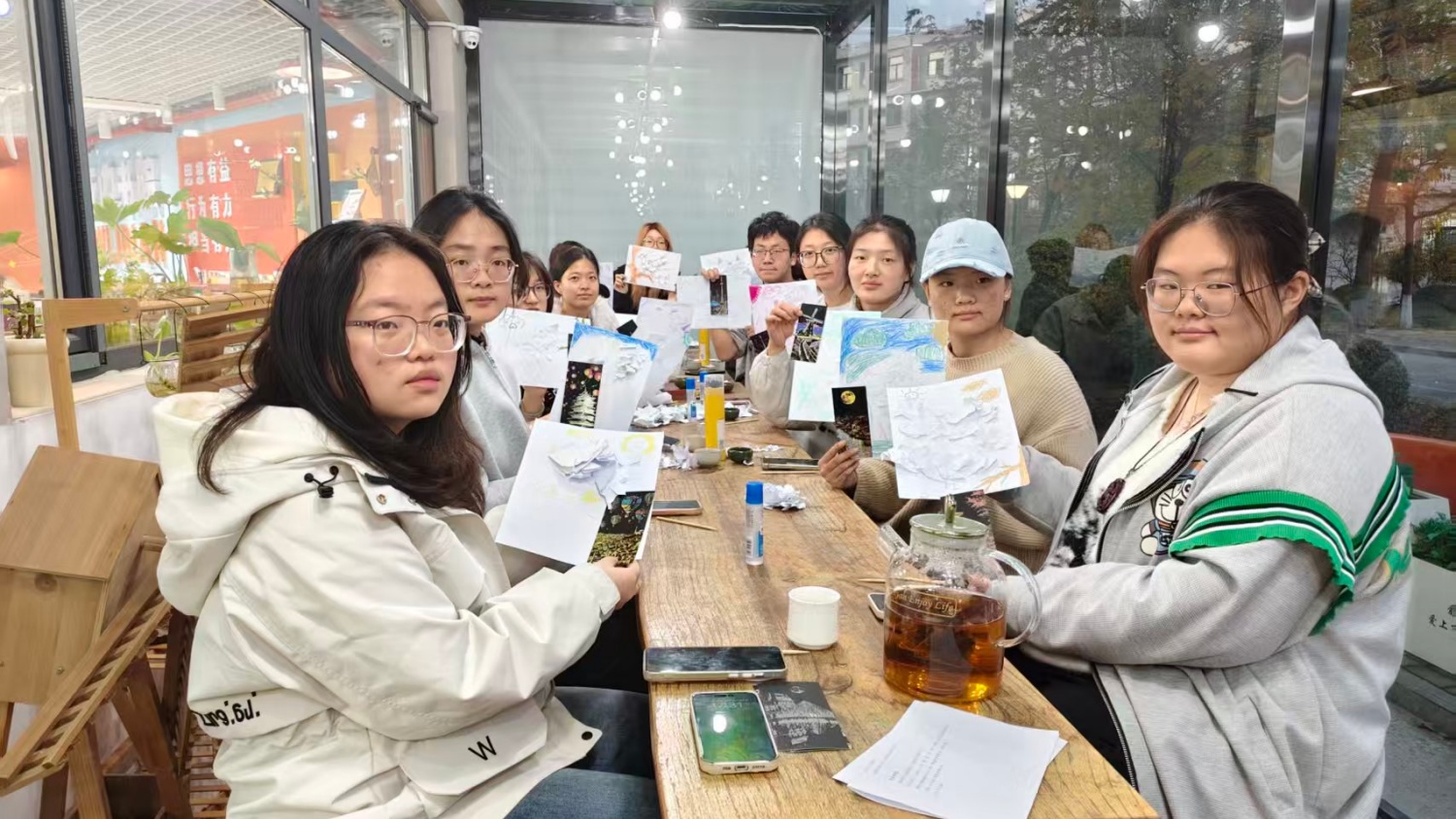 最后是刮画。木笔划过黑色涂层的瞬间,橙黄、湖蓝、浅粉突然跃出,像把乌云刮开,让内心的阳光重新露脸。我刮出半片月亮、几缕浮云,听见旁边男生举着刚出现的星星轻笑:“原来我心里还有这么亮的东西。”分享时刻,有人举着“碎纸鸟”说“这是我的翅膀”,有人轻抚刮画低语“原来我没那么糟”。老师续茶时说:“就像这茶,沉下去,才会慢慢打开。”我捧着温热的茶杯,感觉内心的皱褶也被一点点熨平。