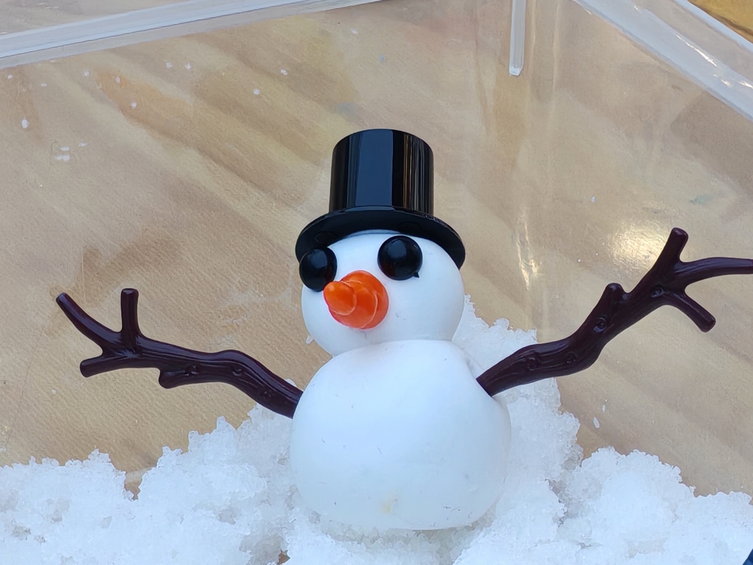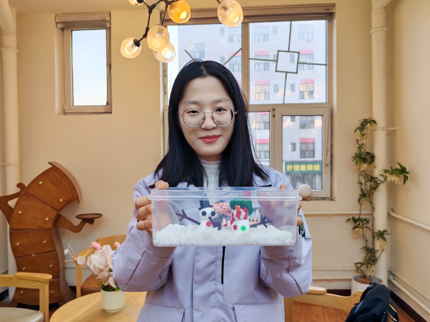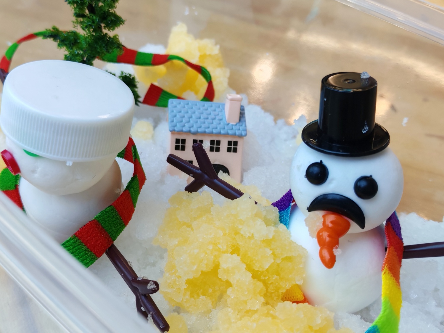 在完成造雪实验后,活动进入了创意表达环节。同学们以自制的人造雪为主要素材,结合黏土、卡纸、马克笔等多种材料,创作出了一件件别具一格的科学艺术作品。有的小组将人造雪与瓶盖、微型仪器巧妙结合,构建了室外的微缩雪景;有的小组则用粘土材料良好的加工特性创作了“实体小雪人”;还有想象力丰富的同学不同颜色的颜料调配制作出了“彩色雪景盒”。