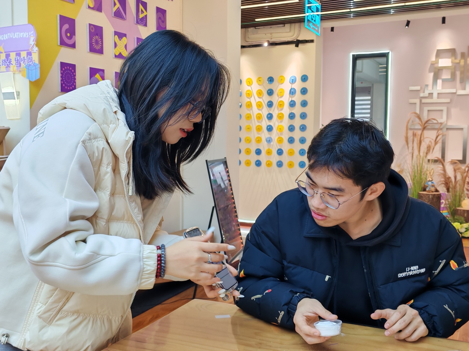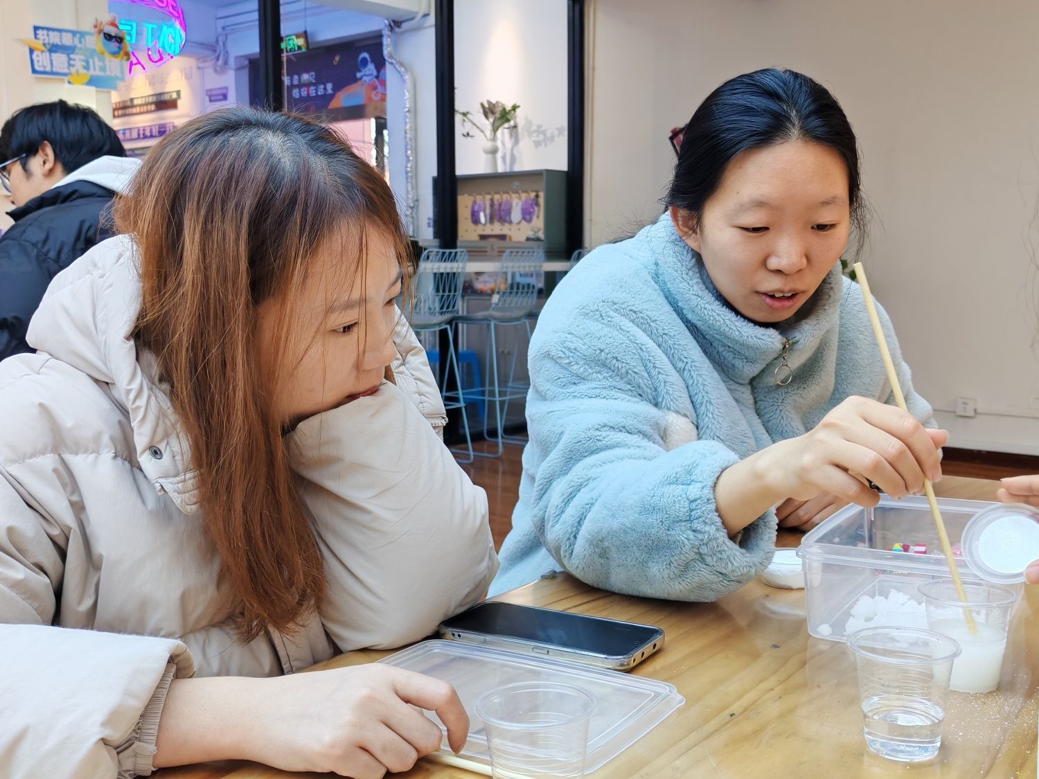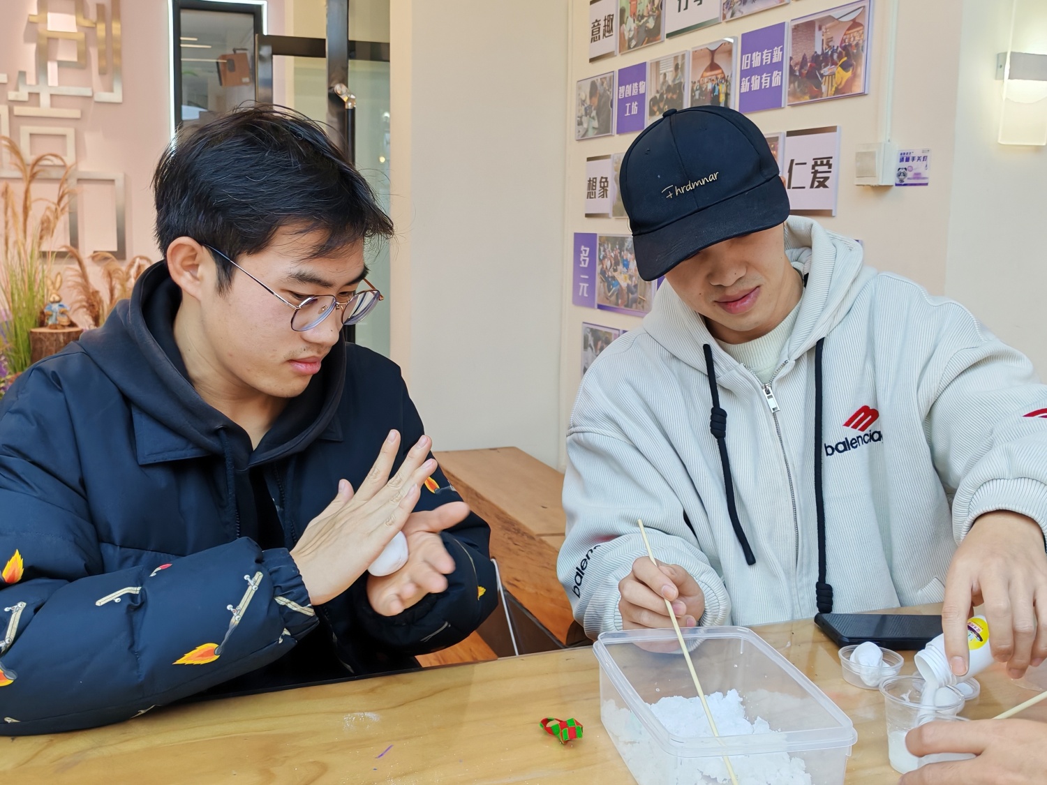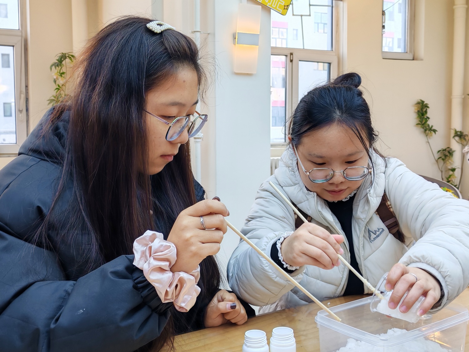 “成功了!我们的‘雪’手感好特别!”现场不时传来同学们的欢呼。更有趣的是,在主持人的引导下,同学们还尝试调节粉末与水的比例,形成不同配比下的“雪花”形态。有的小组制作出了细腻如沙的“粉雪”,有的则得到了蓬松柔软的“鹅毛大雪”。这种对比实验不仅增强了活动的趣味性,更让同学们对材料特性有了更直观的认识。