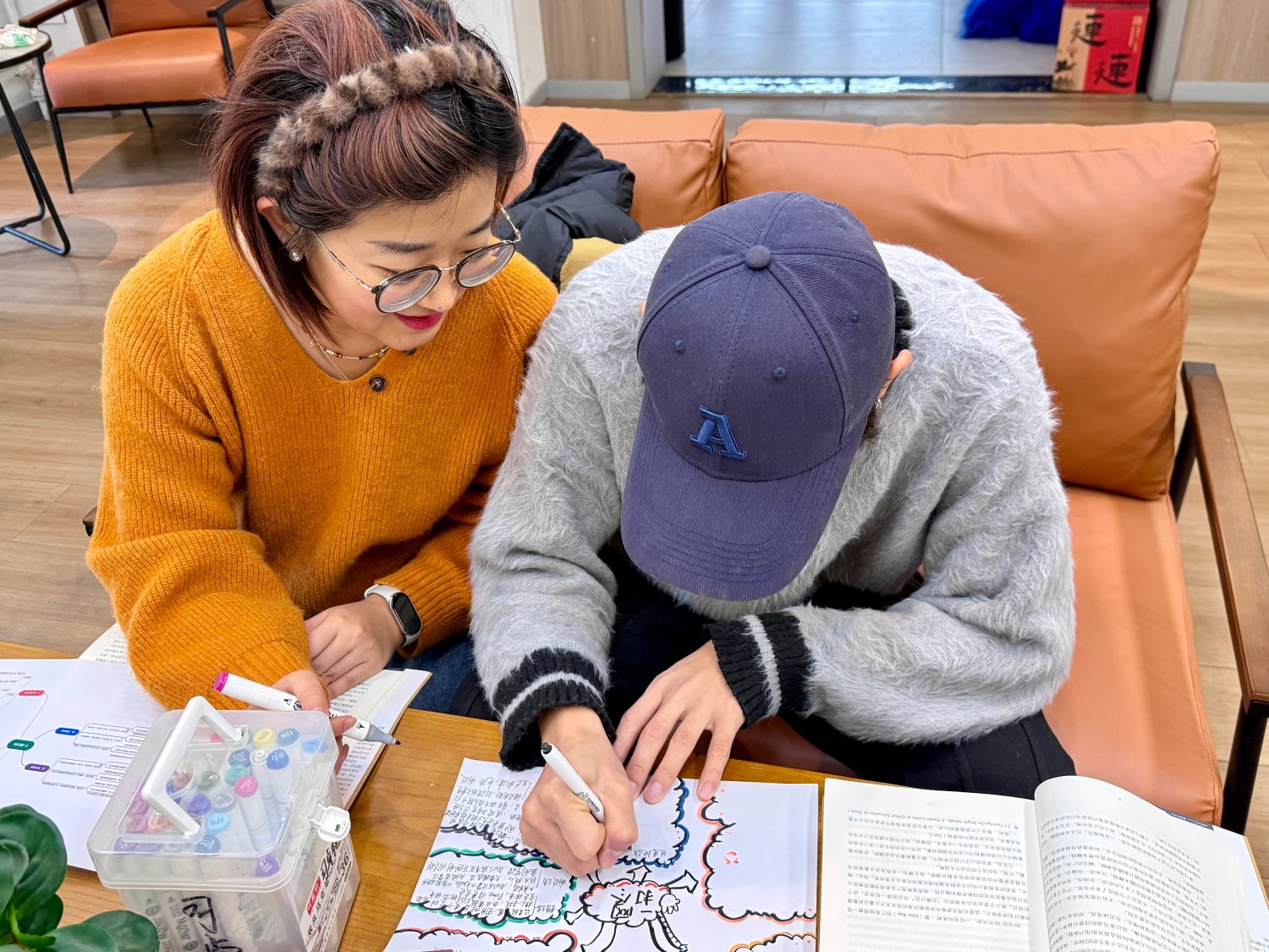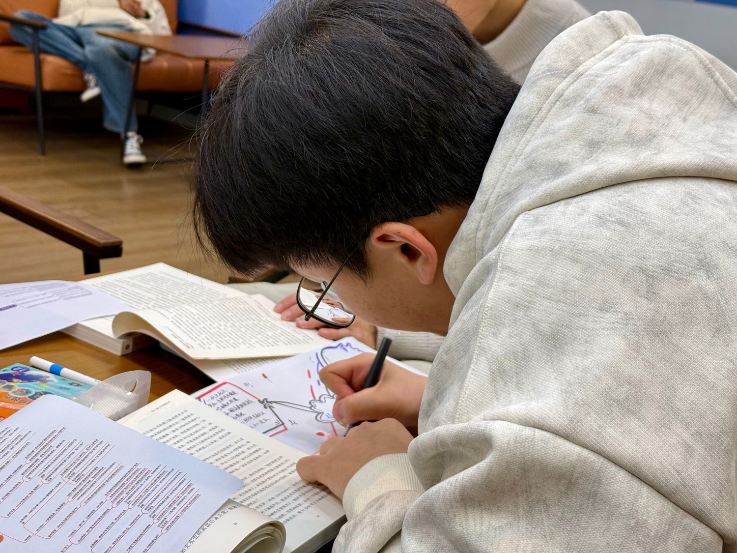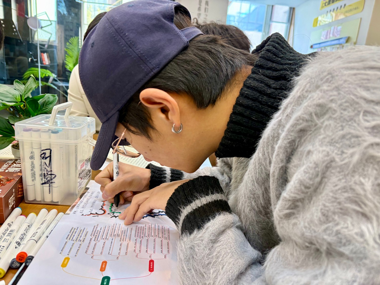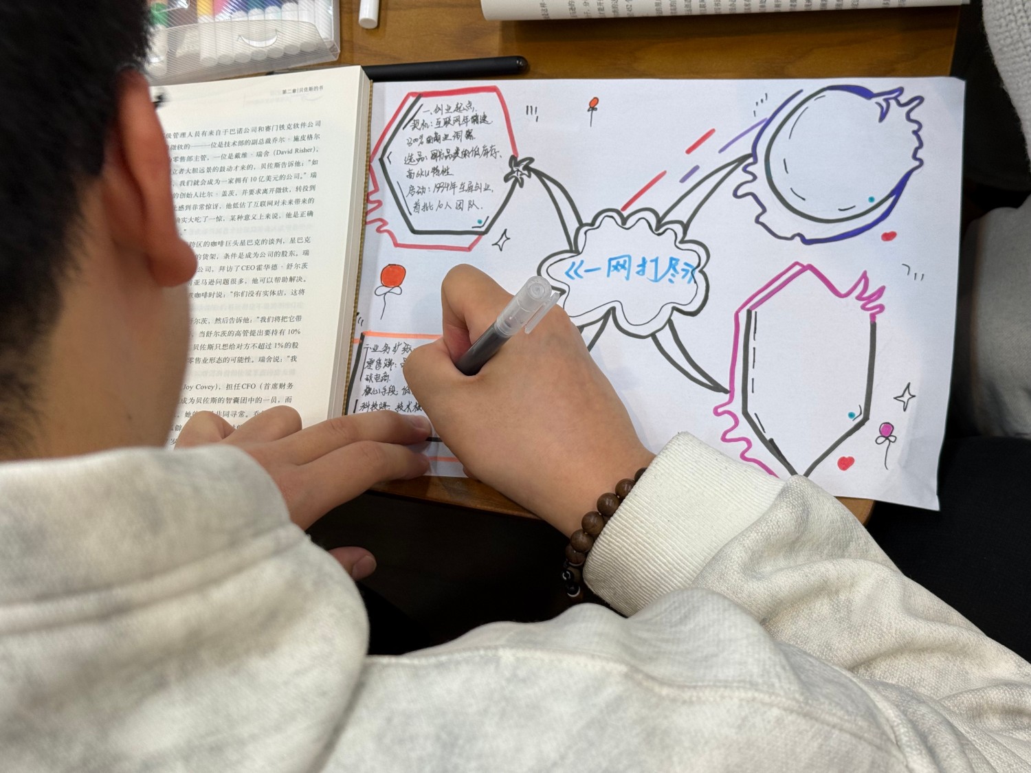 第二次对《一网打尽》的商业系统解构研讨中,学生们以书籍为锚点,搭配荧光笔、便笺纸等工具,通过思维导图与手账创作,开启了一场对互联网巨头底层商业逻辑的深度解码。“今天我们不是‘读完一本书’,而是一起做一次‘商业系统拆解’。”高老师笑着开场,这不再是对一本书的文本阅读,而是以“系统工程思维”拆解亚马逊帝国——从图书业务的野心原点,到贝佐斯长期主义的战略定力,从数据驱动下的效率闭环,到组织文化的基因编码,每一个板块都是对商业系统“架构-接口-迭代”逻辑的具象推演。