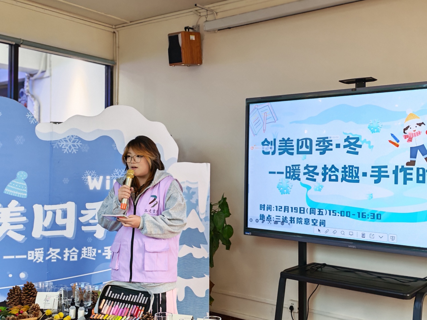 冬意渐浓,暖意融融。12月19日15:00-16:30,三达书院联动王乐,李洋,白雪婷,杨慕豪,张甜甜,杨美斌6位全生异科导师,于书院意空间参加“创美四季・冬:暖冬拾趣,手作时光”活动。聚焦创造力、想象力与传统文化的融合,串联暖心问答、香薰制作、冬日寄语三大沉浸式环节,在导师们的共同引导下,同学们在动手协作中沉淀情绪,创造专属冬日温馨记忆的同时,感受中华节气文化与手作创造交织的独特魅力,为校园添上一抹治愈的冬日暖意。