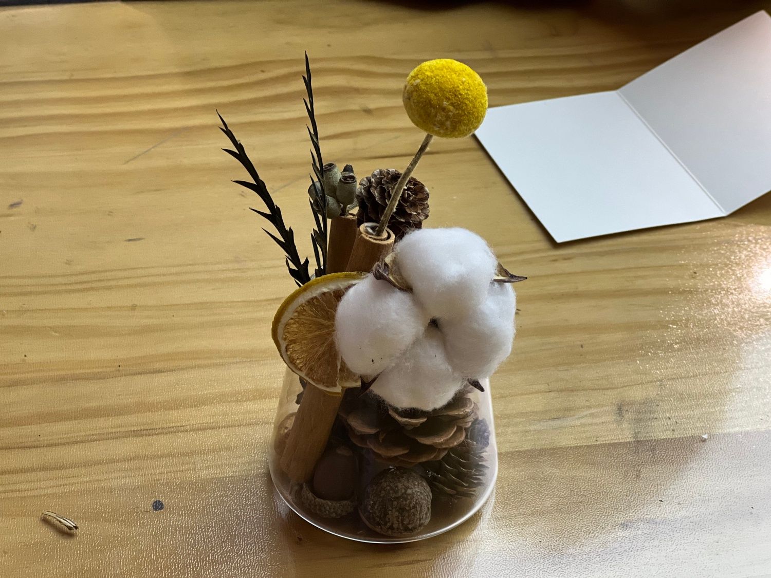 意空间摇身一变,成为一个充满创意协作的香薰区。同学们化身为“冬日匠人”,开启凝驻冬日·自然香氛的创作。大家挑选玻璃凝香瓶,搭配松果、尤加利叶、干橙片等材料,用层次与色彩构建微缩冬景:有的以松枝模拟雪原上的劲松,有的用橙片点缀出暖冬氛围。随后,大家将雪松、柑橘等香薰精油缓缓注入瓶中,看着液体浸润材料,空气中渐渐弥漫起清冽又温暖的气息,每一瓶都封存着独属于自己的冬日记忆。