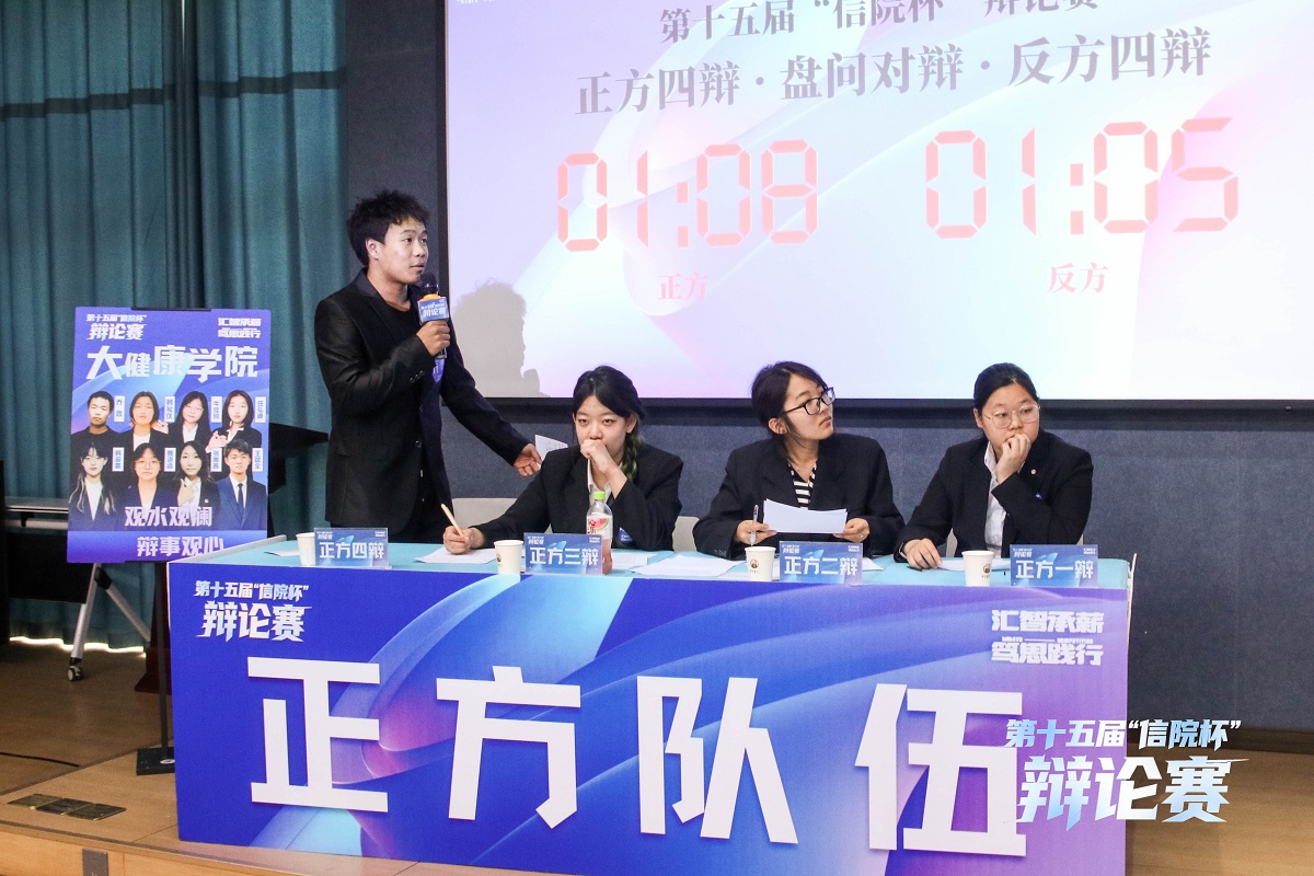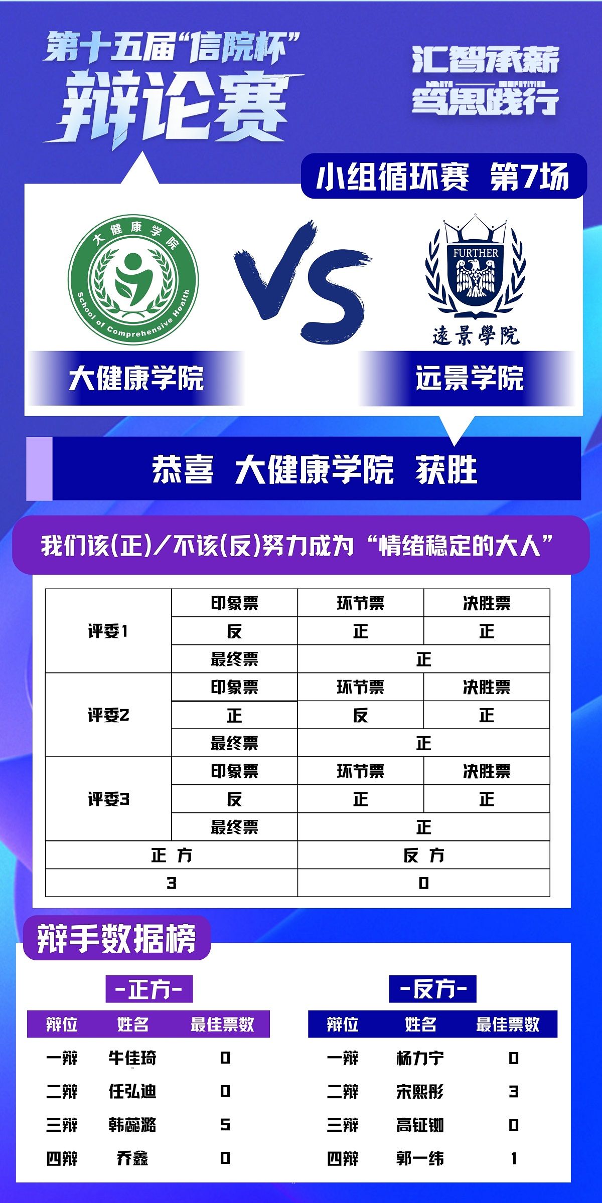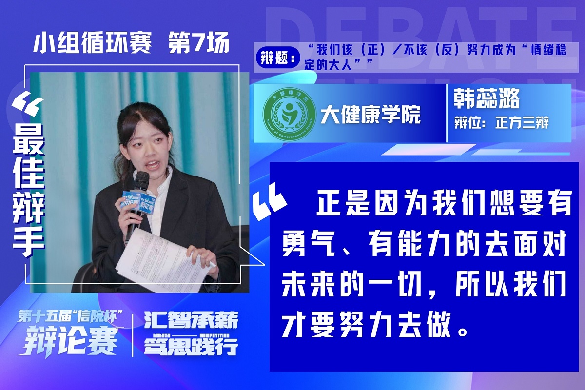 本场对决聚焦“情绪稳定”与“真实自我”的成长选择。正方大健康学院立足“责任与能力”,结合现实案例论证情绪稳定是规避人际伤害、高效解决问题的核心素养,是成年人走向成熟的必修课。反方远景学院则从“社会期待绑架”与“青年成长规律”切入,以数据佐证情绪稳定已经成为社会对成年人的刻板要求,力主大学生应保留鲜活天性,在真实情绪表达中完成自我探索。最终,正方大健康学院获胜,正方三辩韩蕊潞获评本场“最佳辩手”。