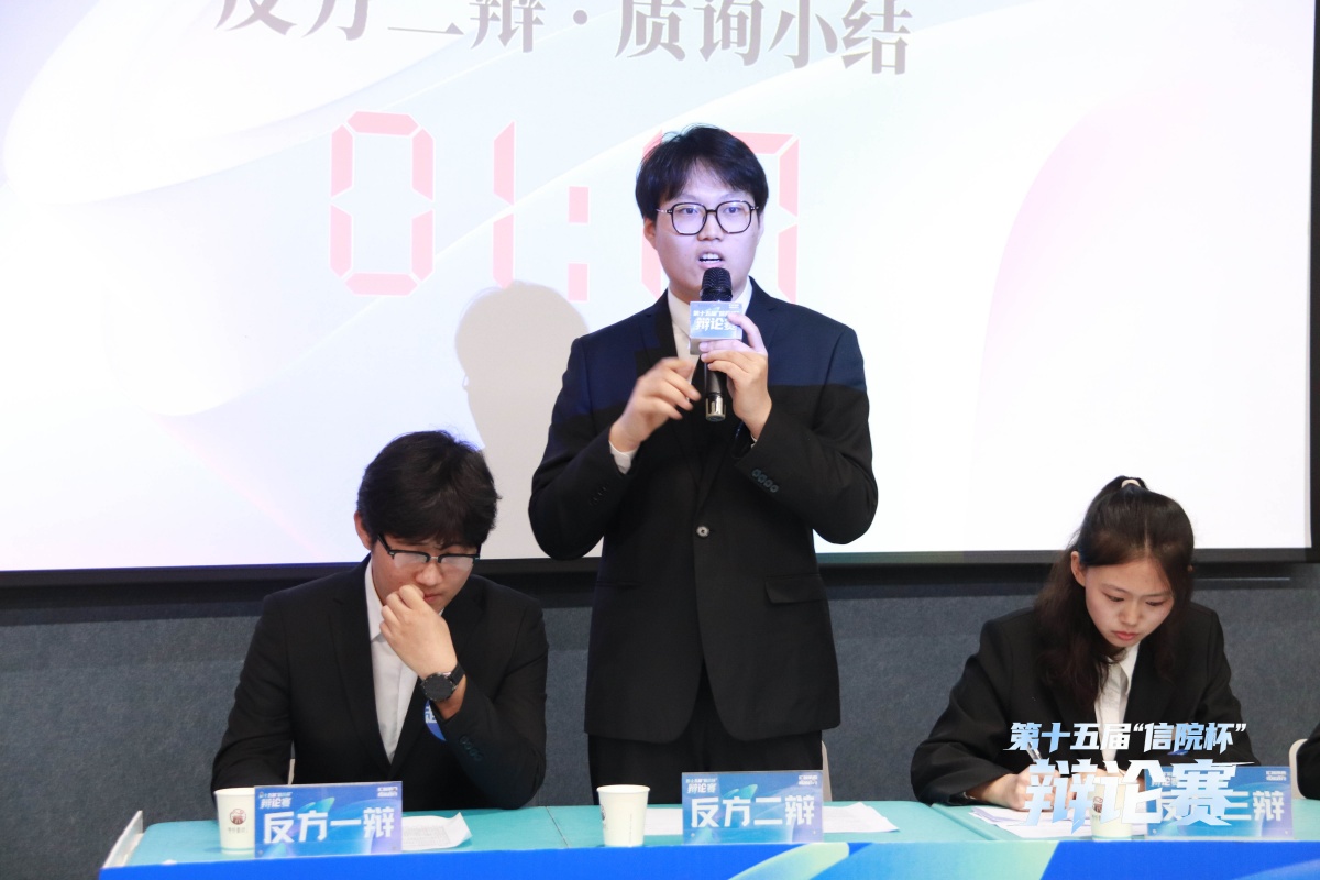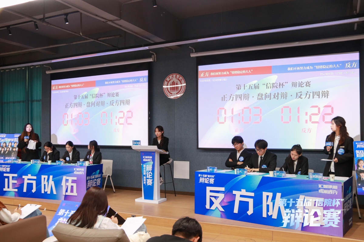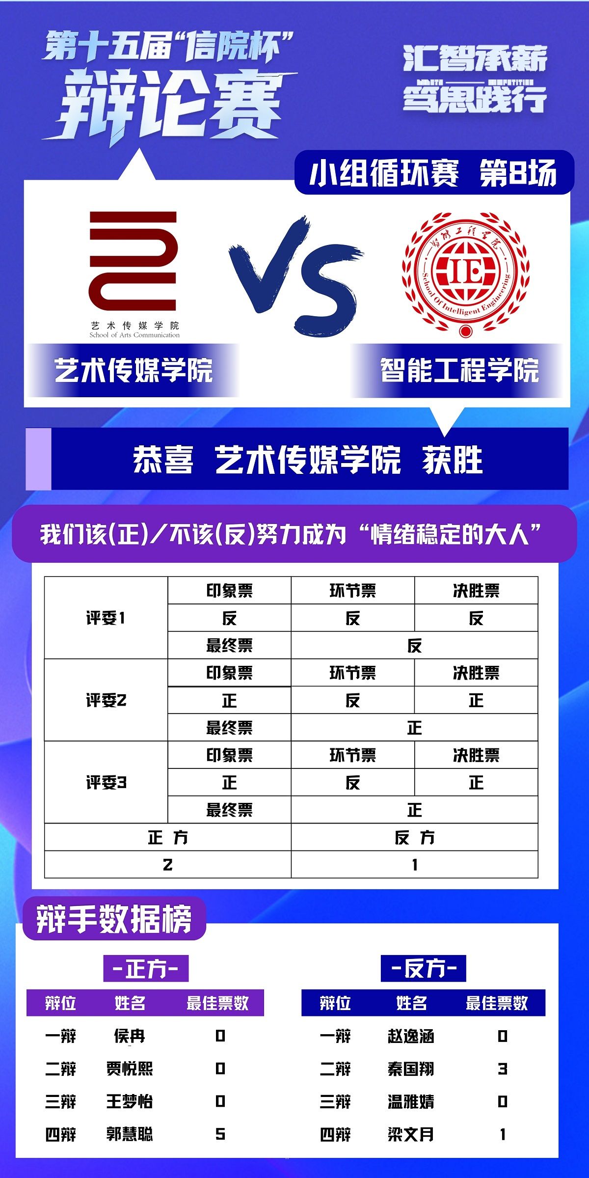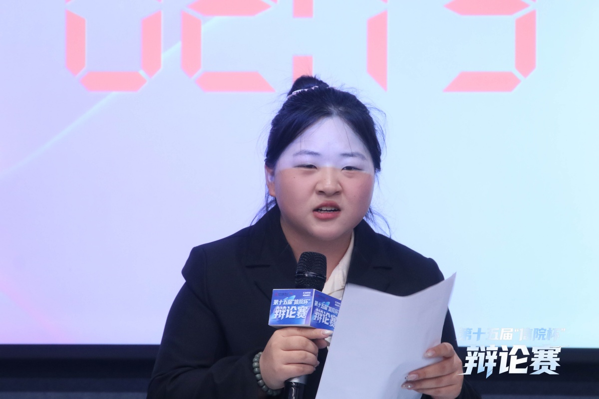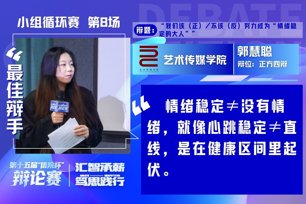 正方艺术传媒学院立足人文视角,提出成为情绪稳定的大人是接纳并非驾驭情绪,结合艺术创作中情绪的价值展开论证。反方智能工程学院则从理性维度切入,主张不必刻意成为所谓“情绪稳定的大人”。自由辩论环节,双方就“情绪自由与情绪责任的边界”“成长是否等同于情绪的驯化”展开激烈攻防。最终正方艺术传媒学院获胜,正方四辩郭慧聪获评本场“最佳辩手”。