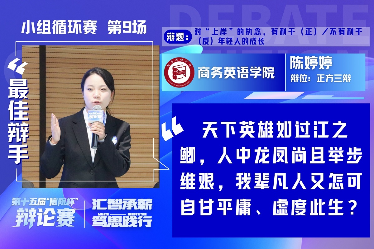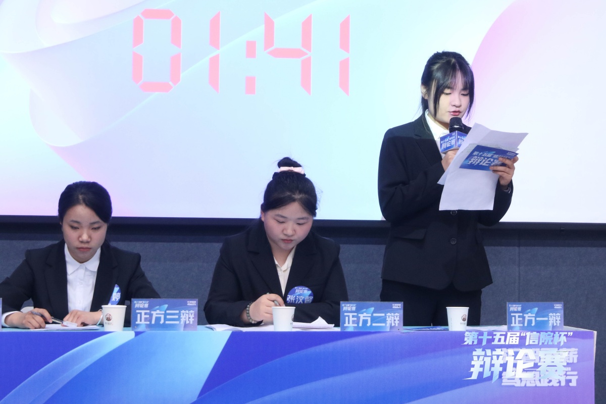 正方商务英语学院开篇立论,将“执念”定义为心底清醒的笃定与始终如一的坚持,以高校毕业生就业数据、国家人才需求趋势为依据,从“上岸执念让个人追求契合社会发展”“坚定目标方向”论证观点,并以北大才女刘媛媛的逆袭案例佐证执念对成长的推动作用。反方信息工程学院直击核心,就“执念与目标的区别”“执念是否接受失败结果”等问题展开激烈攻防,指出过度执着于“上岸”会窄化年轻人对成功与成长的多元理解,使其在单一赛道中陷入内耗,反而错失更多发展可能。最终反方信息工程学院获胜,正方三辩陈婷婷获评本场“最佳辩手”。