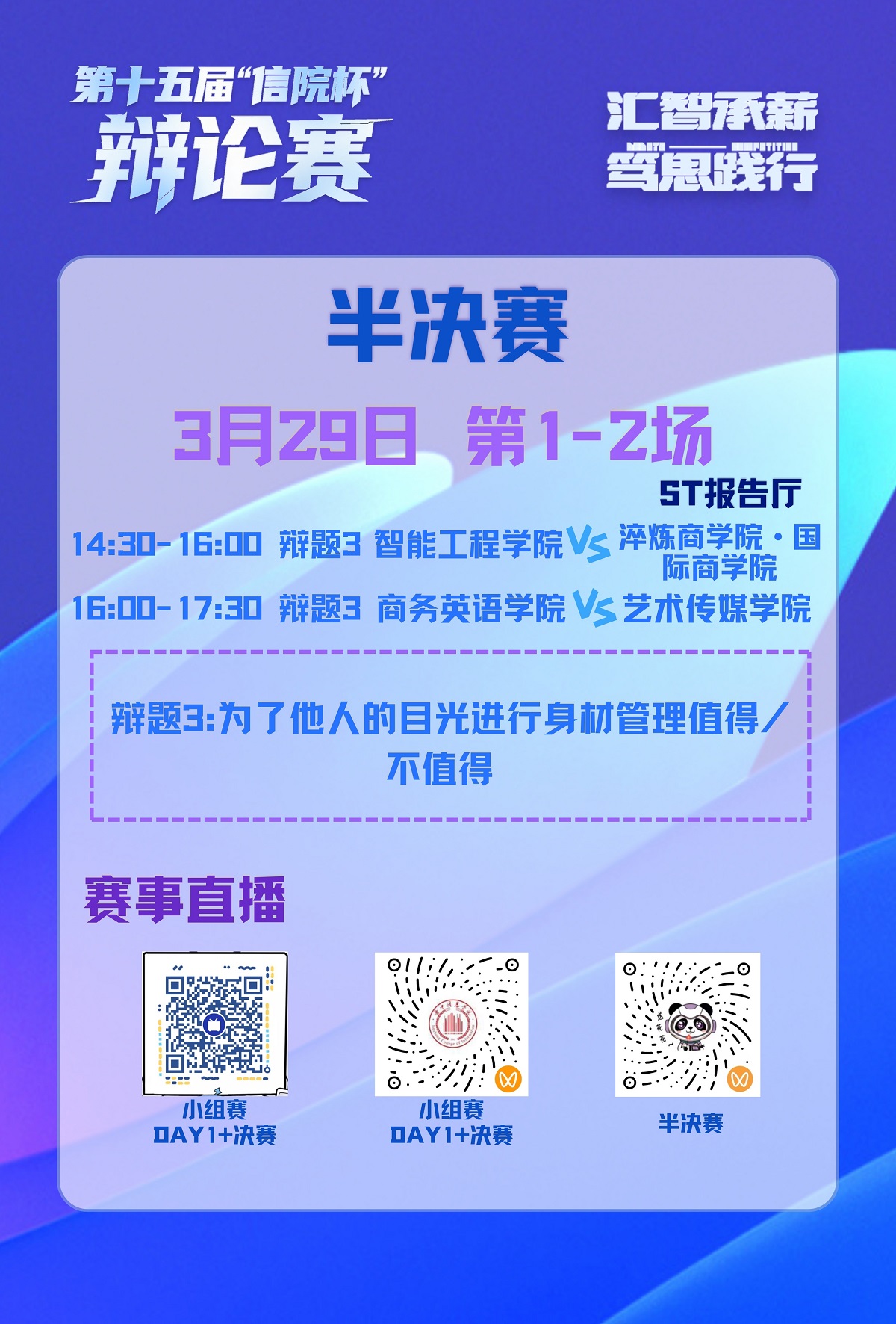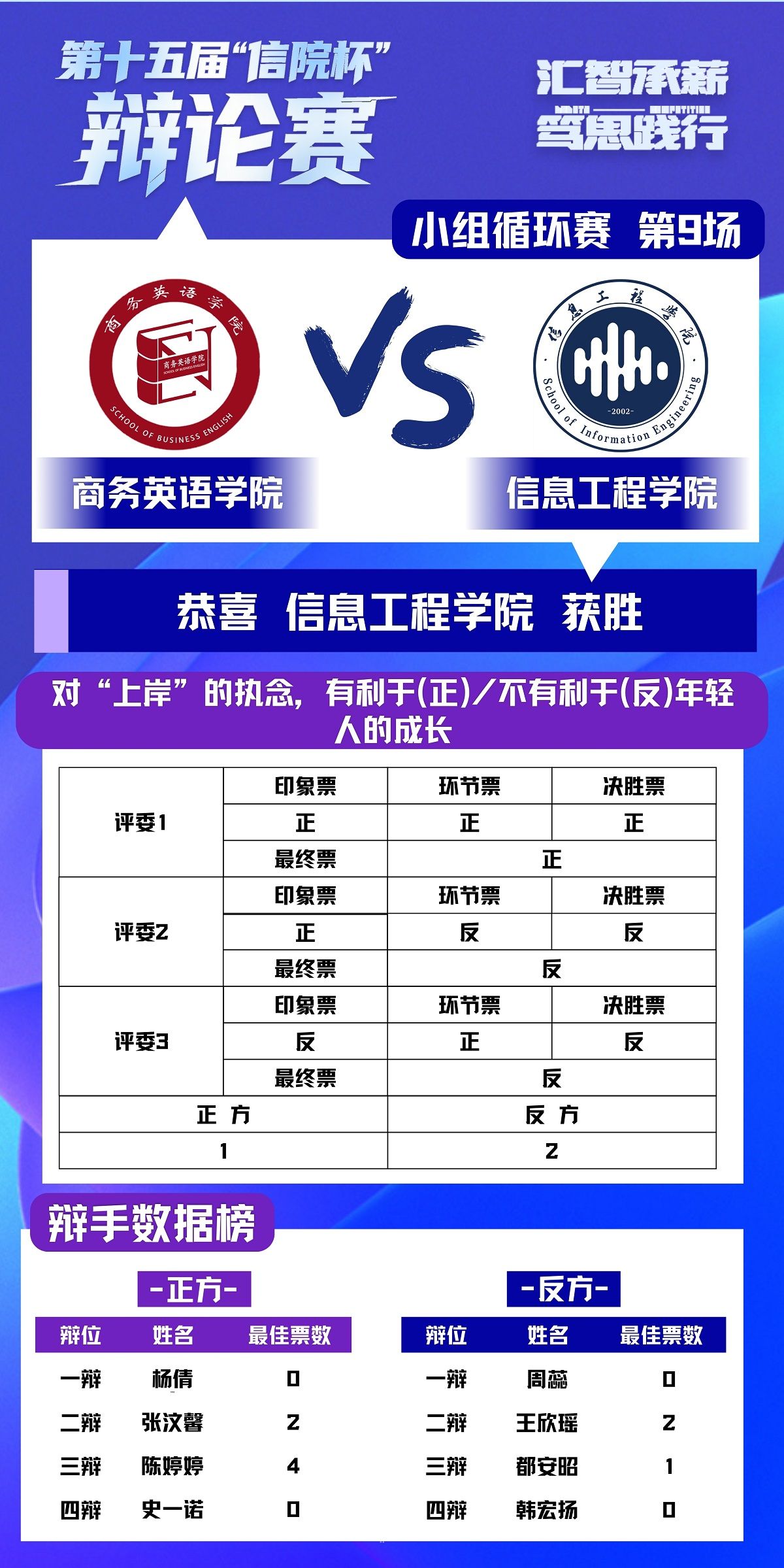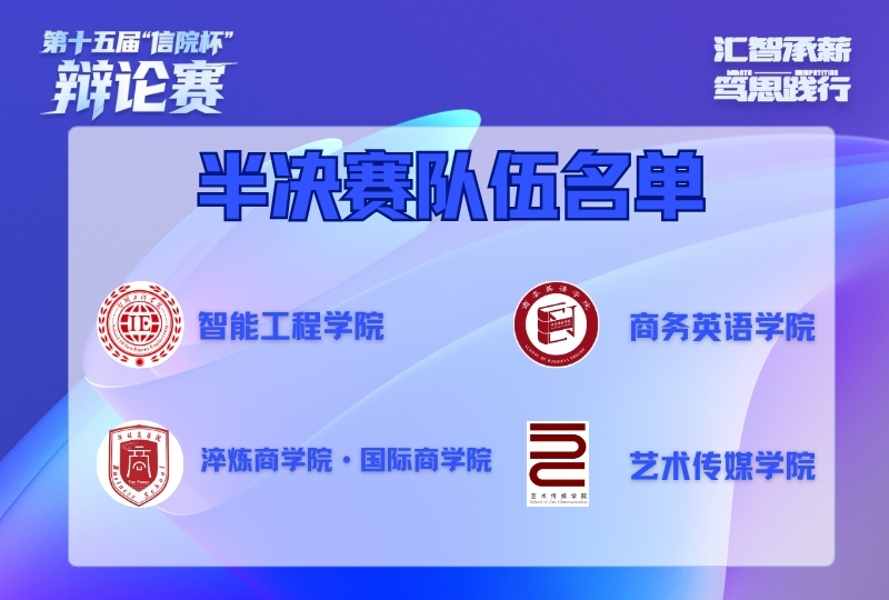 第十五届“信院杯”辩论赛小组赛,第三日热血开赛,七支队伍,四个名额,谁能突出重围,站上半决赛舞台?悬念揭晓!最终智能工程学院、商务英语学院、淬炼商学院·国际商学院、艺术传媒学院成功晋级,会师半决赛!