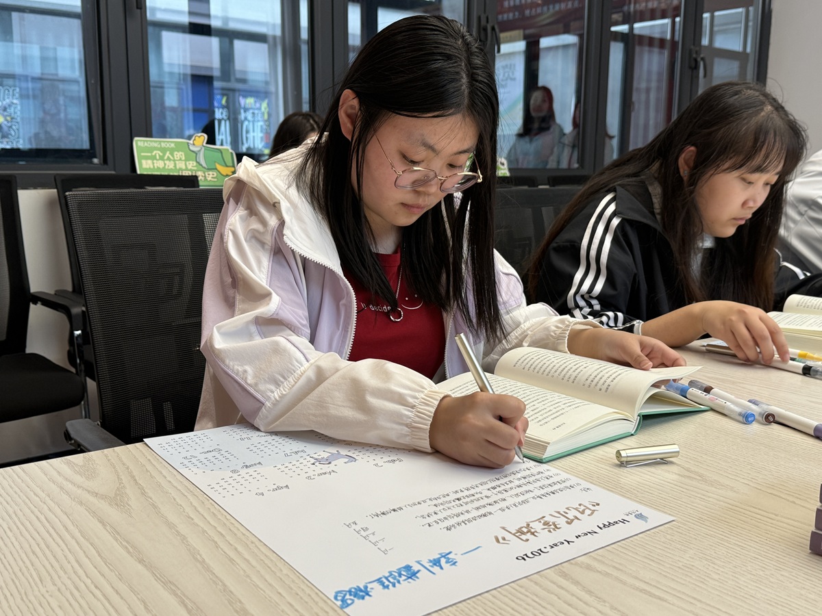活动的最高潮,当属张楠老师带领大家亲手制作专属2026年“大咖日历”的环节。张老师一边演示制作步骤,一边分享她对“日历”这一日常物件背后时间意义的思考:“日历不仅是日期的记录,更是我们与时间相处的方式。把书中的智慧装进日历,就是把成长嵌进每一天。”同学们纷纷拿起剪刀、胶棒与彩纸,将刚刚阅读中的感悟与创作元素融入日历的设计之中。有的将《论语》中的金句摘录下来,搭配水墨风格的插画;有的将《巴菲特传》中的投资箴言做成小标签,贴在每一页的角落;还有的将《郑裕彤传》中“诚信为本”的经商理念,用书法字体郑重地写在扉页上。在剪剪贴贴、涂涂画画之间,一本本独一无二的手作日历逐渐成型,承载着同学们对未来的期许与对知识的敬意。