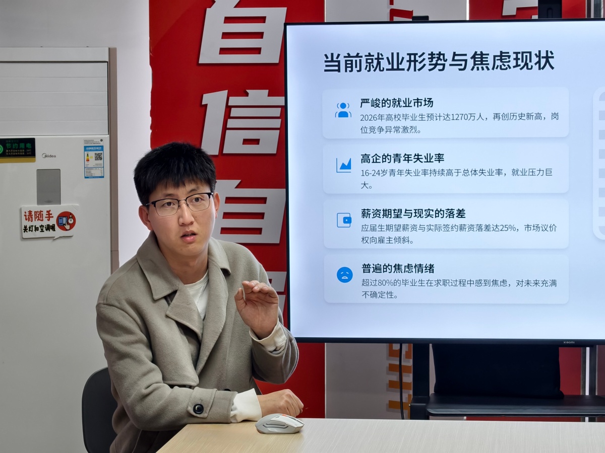 面对日益严峻的就业形势,高校毕业生普遍面临较大的求职焦虑。为帮助学生有效应对这一挑战,杜鹏老师围绕求职焦虑的主要来源展开分析,指出外部环境压力、自我认知偏差、社会期望压力和支持系统断层是焦虑情绪的主要诱因。通过“认知重构”与“行动激活”两种科学方法,学生可以学会识别负面思维、设定可执行的小目标,并运用积极自我暗示,逐步重建对求职过程的掌控感,实现从“被动焦虑”到“主动应对”的转变。