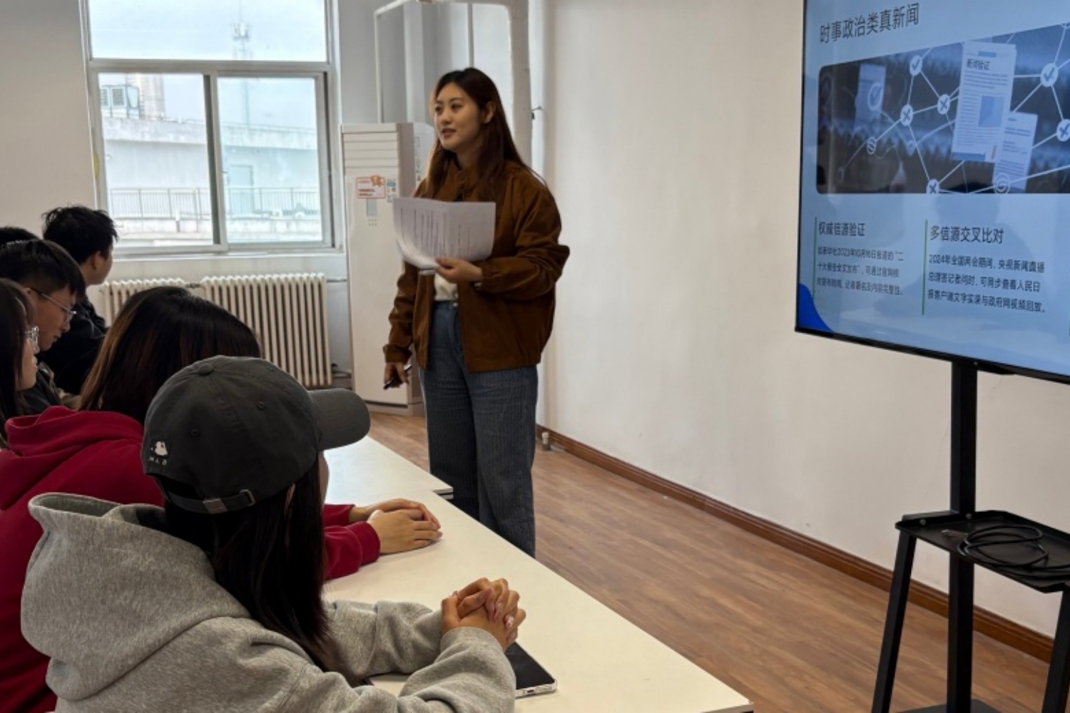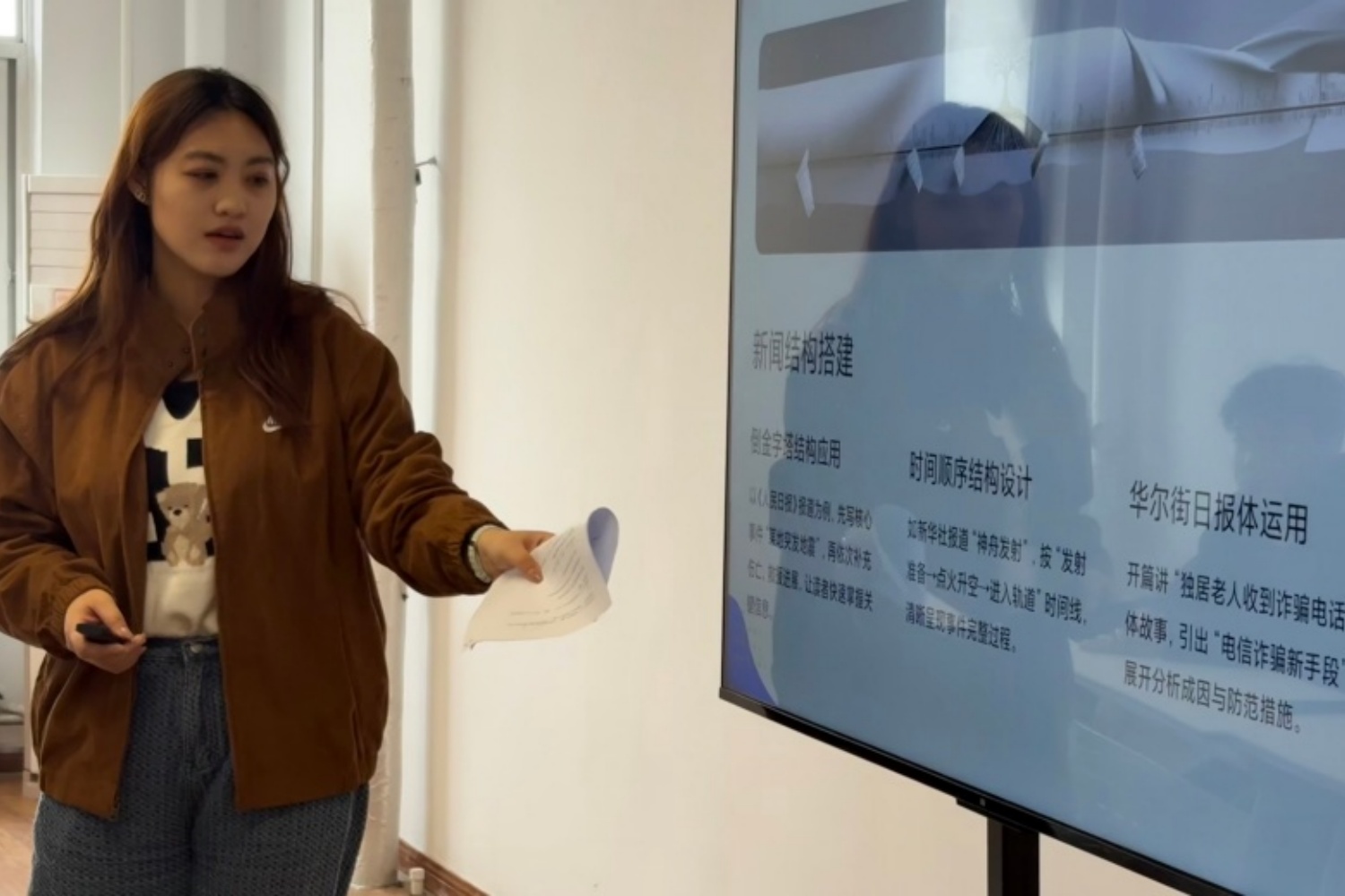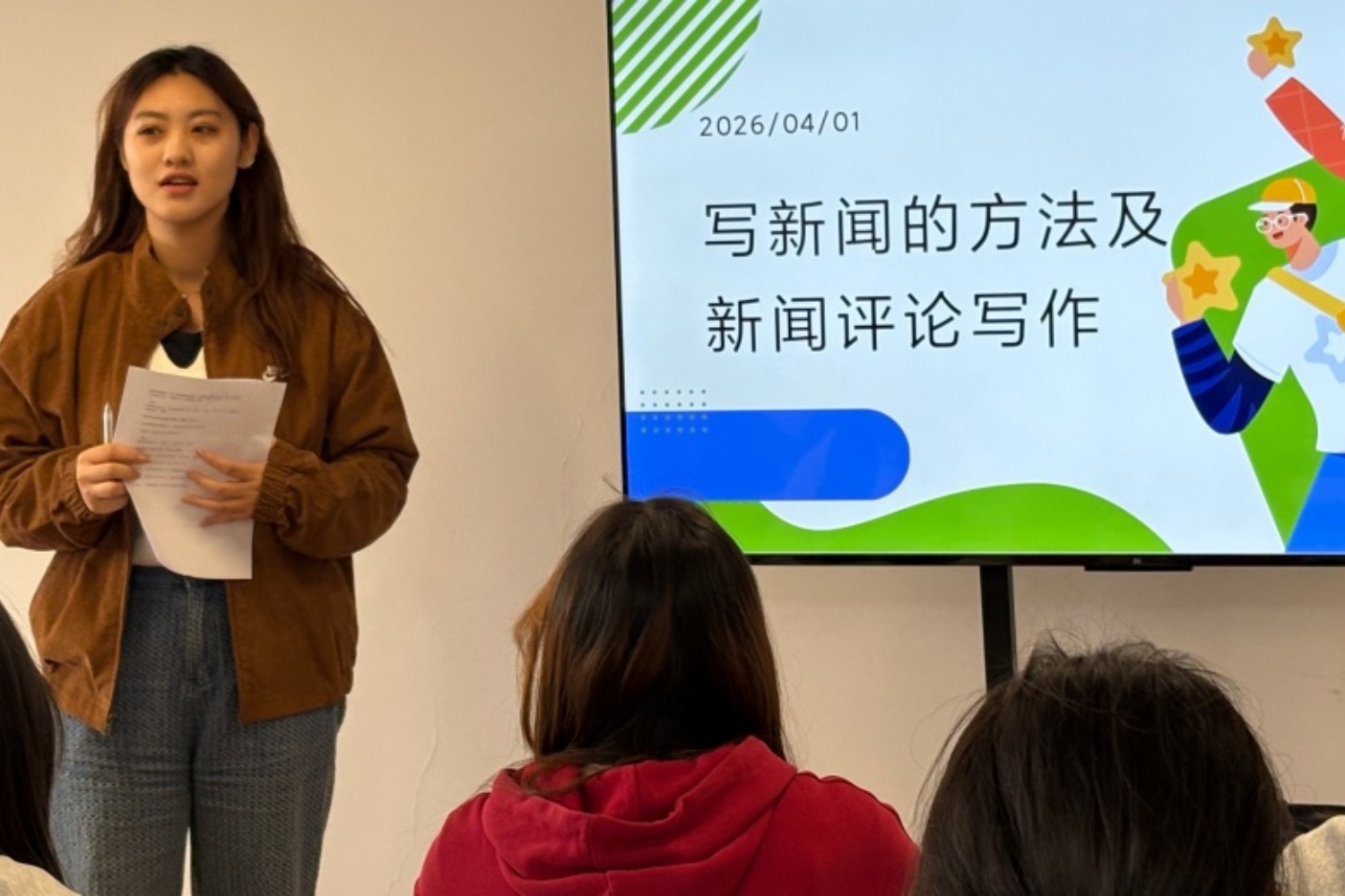 干货讲解环节,薄老师将新闻稿写作的全流程拆解得清晰明了。在新闻选题方面,老师分享了结合热点事件、关注民生痛点、挖掘行业深度三种实用思路;在采访准备环节则强调背景资料调研、问题分层设计、设备调试等细节要点;在语言表达上,着重讲解了准确性、简洁性、客观性三项基本原则。这些内容既有理论高度,又贴近实际操作,有效解决了同学们日常写稿中的诸多困惑。