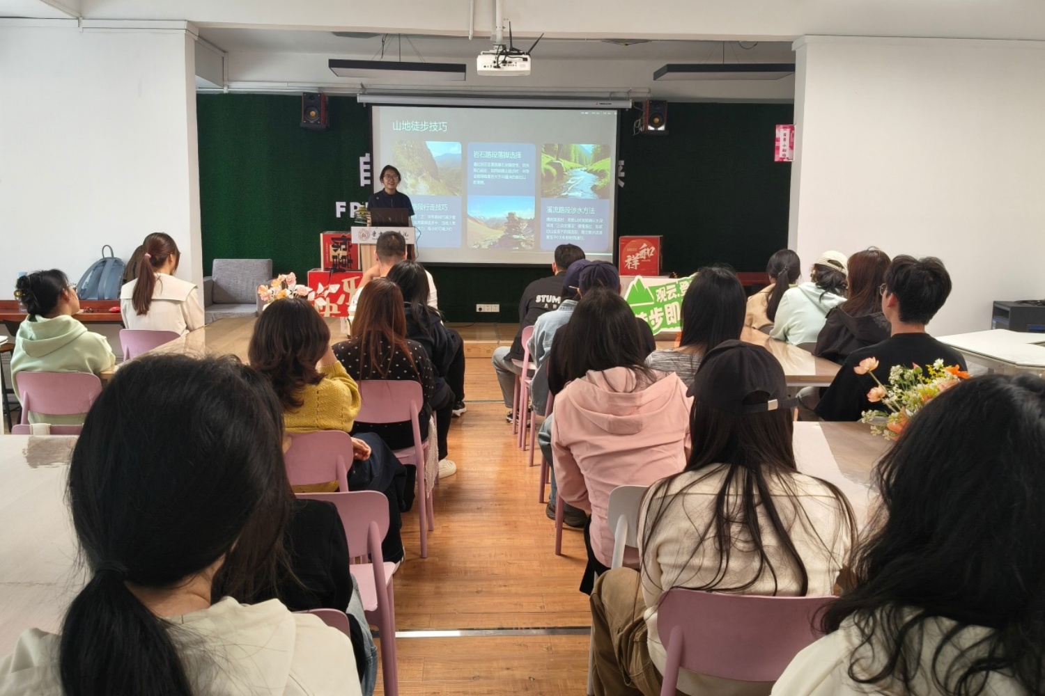 活动伊始,刘小源同学结合自己多次户外徒步与山野探险的亲身经历,以轻松接地气的方式展开分享。她指出,当前许多同学向往太原周边山野风景,热衷打卡小众路线,在探索自然、挑战自我的过程中,常因忽视地形复杂、路况不明、环境多变等潜在风险,埋下安全隐患。她着重强调:户外探索的乐趣固然可贵,但安全永远是不可逾越的前提与底线。普及专业户外知识与避险技巧,正是本次活动的核心意义,希望每位同学都能真正做到懂安全、会避险、善防护。