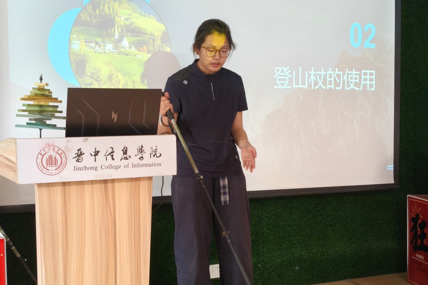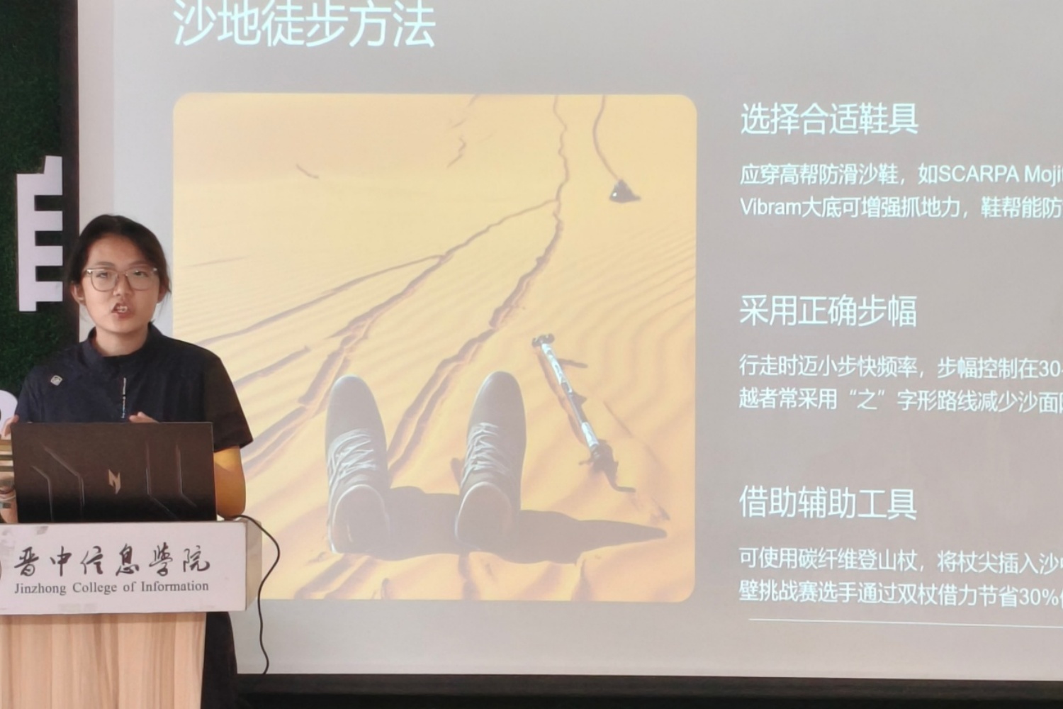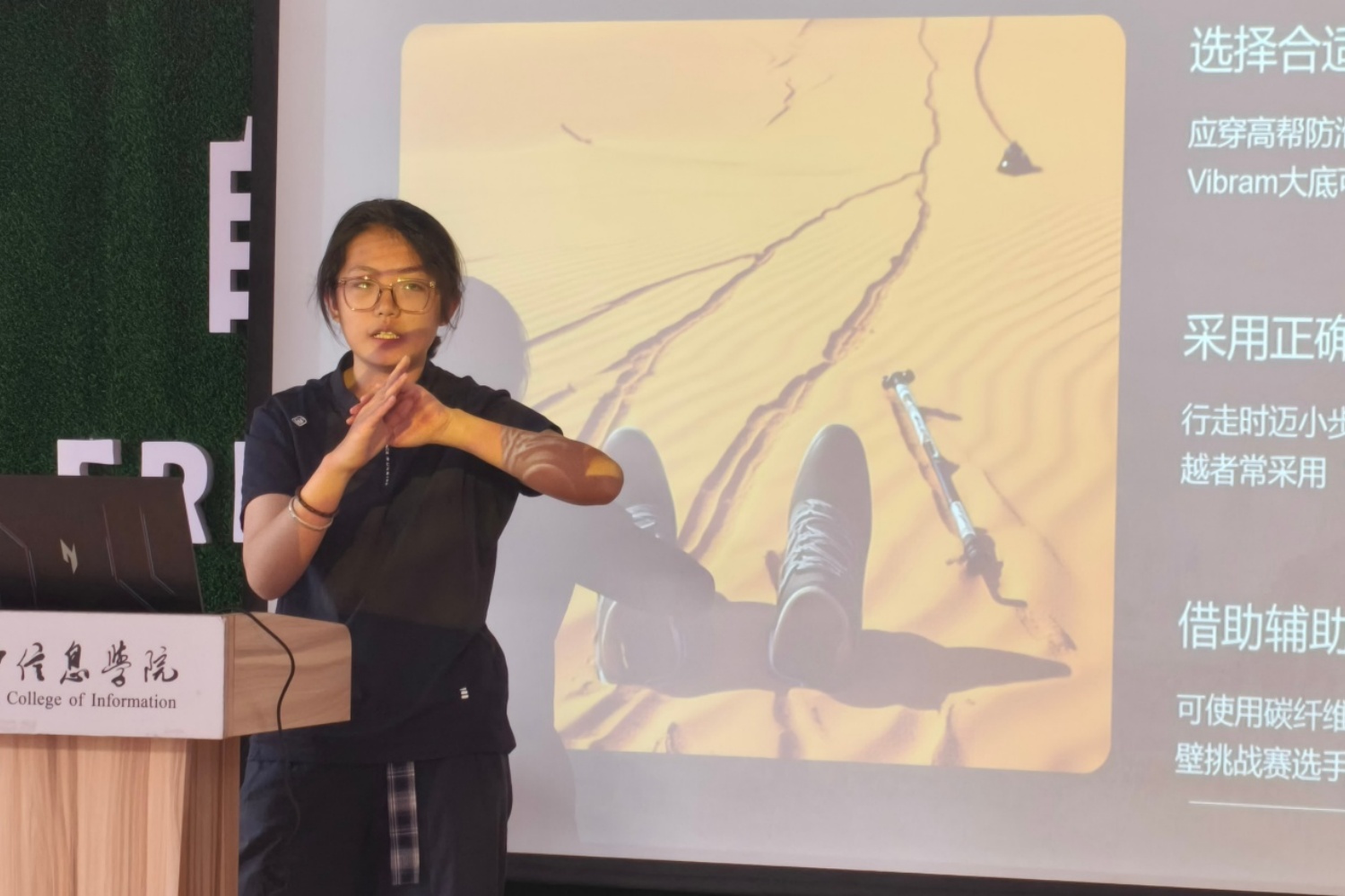 随后,刘小源同学围绕山地徒步、地形辨识、涉水技巧、沙漠出行、装备使用、路线选择六大板块,展开系统、全面的技巧教学。在地形与路线选择上,她结合本地凤凰山及相关野线等实景案例,重点强调“走廊不走沟、踩实不踩松”的核心原则:山间沟壑视野受限、易遇落石积水,而高处廊道路况更稳、视野更佳;松软沙土、松动石块、风化岩壁看似安全,实则暗藏风险,行走时务必仔细观察、杜绝侥幸心理。针对溪流涉水、陡坡攀爬等高频出行场景,她细致拆解三点支撑法的实操要点,提醒大家涉水前务必用登山杖探测水深与水底状况,攀爬时保持重心稳定,绝不盲目行动。