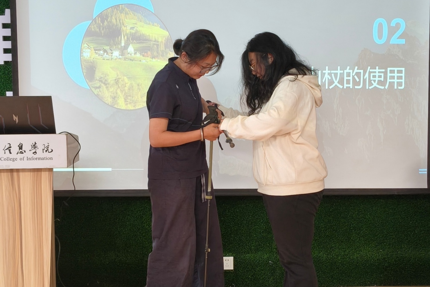 针对沙漠出行这一热门户外选择,刘小源同学进行专项科普:沙漠地形空旷无垠、沙质松软,行走时易出现“进两步退半步”的情况,对体能与耐力要求极高,且昼夜温差大、水源稀缺,出行前必须做好充足规划与物资准备。她同时着重提醒:户外出行切勿跟风打卡未开发野线与危险区域,坚决拒绝独自探险,结伴而行、相互照应是户外安全的核心基础。在装备实操环节,她现场展示登山杖的结构、调节方法与正确使用技巧,从螺旋帽调节、杖尖保护套使用,到上坡、下坡、跨障的不同握持姿势,让同学们清晰地认识到:登山杖是户外出行的“安全拐杖”。在场同学逐一上手调试、亲身体验,在实操中熟练掌握装备使用要点,筑牢出行安全防线。